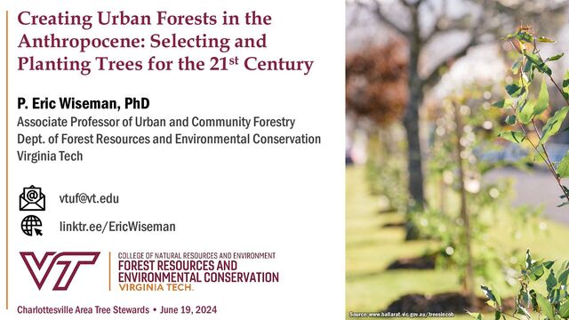 Forestry Dept. of Forest Resources and Environmental Conservation Virginia Tech Charlottesville Area Tree Stewards • June 19, 2024 Creating Urban Forests in the Anthropocene: Selecting and Planting Trees for the 21st Century Source: www.ballarat.vic.gov.au/treesincob [email protected] linktr.ee/EricWiseman
