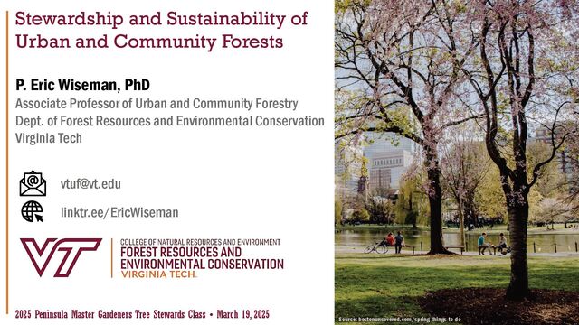 2025 Stewardship and Sustainability of Urban and Community Forests 01 • 11 P. Eric Wiseman, PhD Associate Professor of Urban and Community Forestry Dept. of Forest Resources and Environmental Conservation Virginia Tech [email protected] linktr.ee/EricWiseman Source: bostonuncovered.com/spring-things-to-do