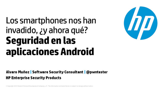 herein is subject to change without notice. Los smartphones nos han invadido, ¿y ahora qué? Seguridad en las aplicaciones Android Alvaro Muñoz | Software Security Consultant | @pwntester HP Enterprise Security Products