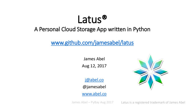Personal cloud storage solutions are common and popular. Many companies provide this capability such as DropBox, Google Drive, Microsoft One Drive, Amazon Drive, etc. However, these applications are closed source, making it difficult for the community to innovate on top of them. latus is a client application written in Python for personal cloud storage. It is open source, and utilizes open source libraries/packages. latus uses 'zero knowledge' encryption so that files can be encrypted prior to being stored in the cloud, providing an additional level of security. It also provides the ability to control where files are stored long term - in the cloud, cold storage, or only on personal systems. latus performs file sync, so that all computers (or "nodes") contain the most current file versions, as well as a file version history. For the cloud storage itself, latus can use existing cloud storage vendors or AWS directly. In this talk I will discuss the major subsystems of latus, the Python packages used, testing, freezing/installing and lessons learned.