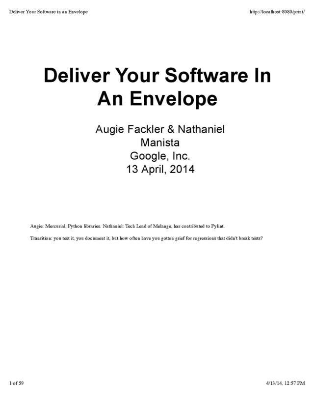 codes than RFC 2616 (HTTP/1.1), which came 3 years later. 402 (Payment required), 206 (Partial content), etc all introduced later, and are safe for existing clients only because of the above defensive specification. RFC 1945: HTTP status codes are extensible[...]. HTTP applications are not required to understand the meaning of all registered status codes[...]. However, applications must understand the class of any status code, as indicated by the first digit, and treat any unrecognized response as being equivalent to the x00 status code of that class, with the exception that an unrecognized response must not be cached. Deliver Your Software in an Envelope http://localhost:8080/print/ 51 of 59 4/13/14, 12:57 PM