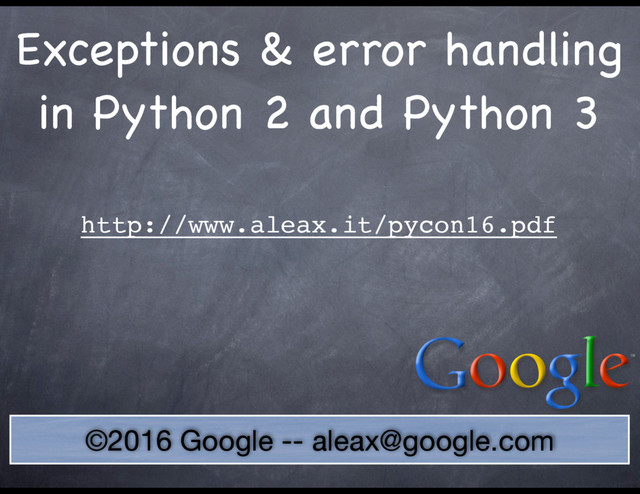 Handling errors and exceptions optimally is crucial in solid Python programs. Some technical details have changed in Python 3, and the talk covers those, but the core of "best practices" is quite enduring, and the talk focuses on presenting and explaining them.