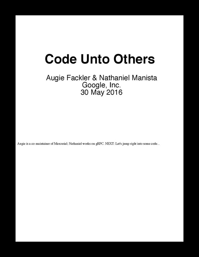 NEXT: Let's jump right into some code... Code Unto Others Augie Fackler & Nathaniel Manista Google, Inc. 30 May 2016 Code Unto Others http://localhost:8080/print/ 1 of 75 5/30/16, 09:41