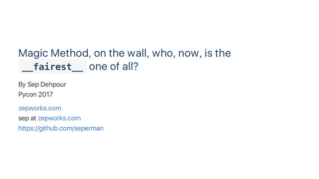 In this talk we explore magic method's capabilities by first designing new interfaces in a series of fun experiments. Secondly, we play with creating undeletable objects and learn about the mighty Garbage Collector in cPython and how a single magic method can overturn the fate of the object. Lastly, we create a lazy Redis client to illustrate a practical application of magic methods and learn about lazy loading.