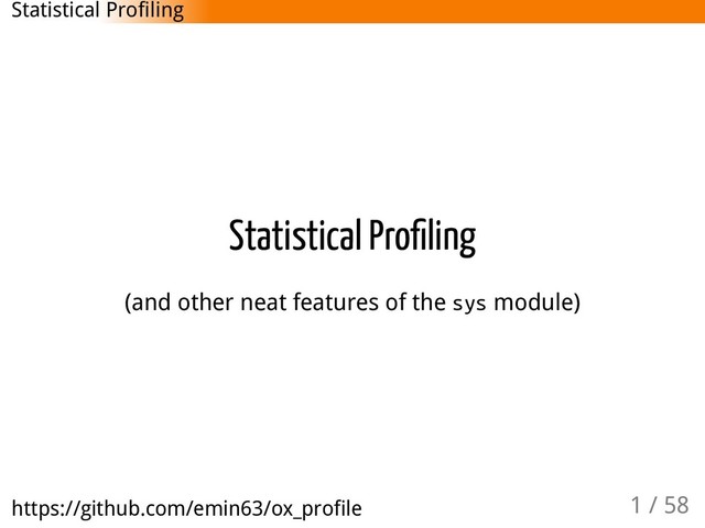 Statistical profiling involves occasionally sampling what your program is doing instead of watching each line or function. A key feature of statistical profiling is that by using a moderate sampling frequency, you can profile your production code with almost no overhead. This lets you find the actual bottlenecks in real use cases.