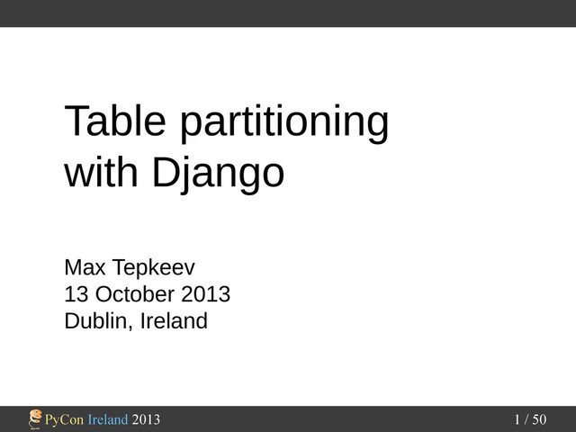 This talk will cover table partitioning theory in general, different partitioning methods: horizontal and vertical partitioning. We will talk about partitioning criteria, how partitions can be organized: range partitioning, list partitioning, hash partitioning and composite partitioning. We will also talk about partitioning implementations in different database servers, how they differ from each other, what problems can we face because of that difference. Django provides us with great database abstraction and ORM, but how can we use it with table partitioning ? We will talk about existing libraries for Django to work with table partitioning, how they differ, which is the best (if any) and why.