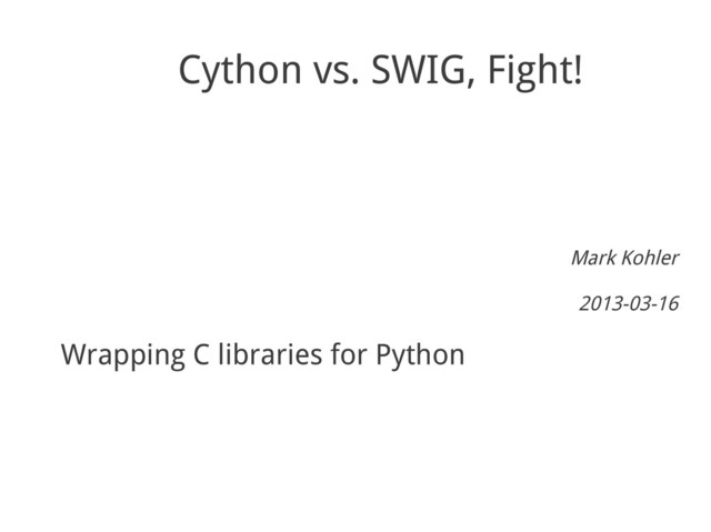 Cython vs. SWIG, Fight! Mark Kohler 2013-03-16 Wrapping C libraries