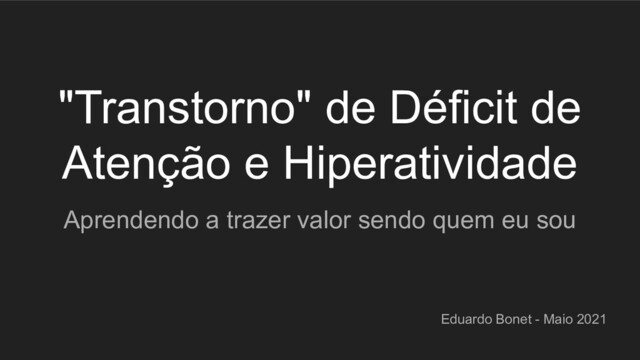 objetivo é mostrar uma realidade diferente, onde a TDAH não é motivo de culpa, e trazer ideias que possivelmente ajudem a entender a sua TDAH ou a de uma pessoa próxima. RESSALVA 2: Eu não sei direito o que estou fazendo
