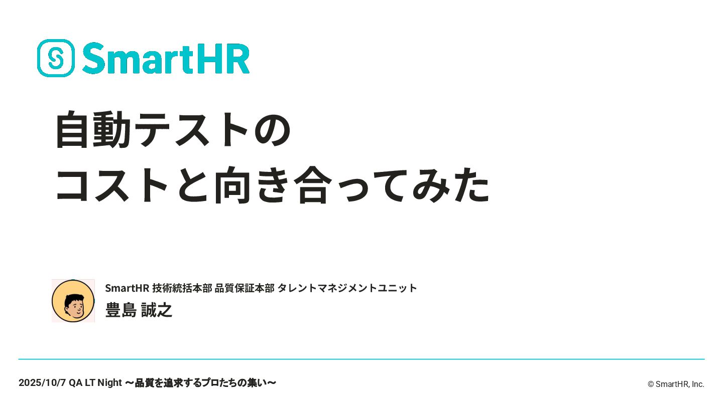 © SmartHR, Inc. ⾃動テストの コストと向き合ってみた 豊島 誠之 SmartHR 技術統括本部 品質保証本部