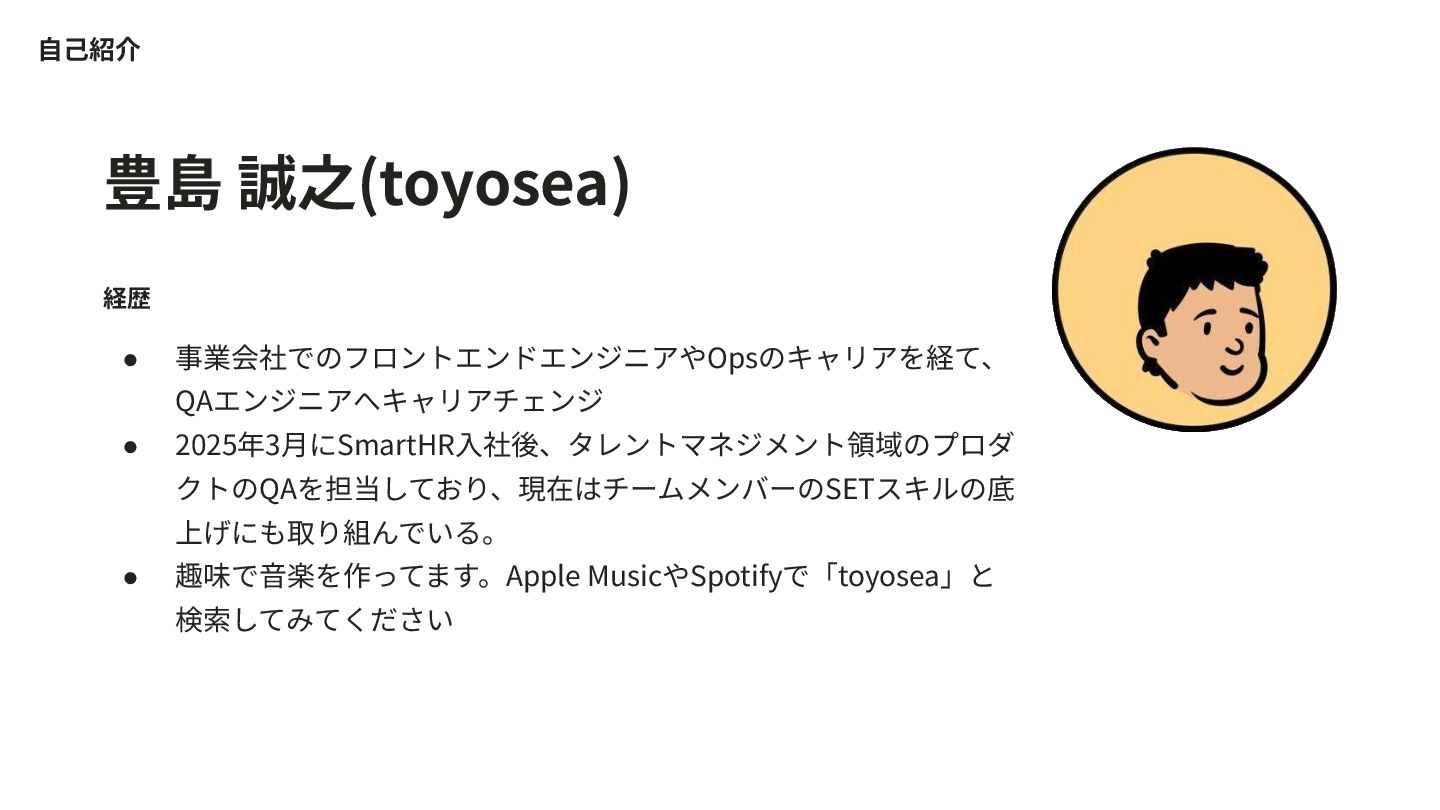 豊島 誠之(toyosea) 経歴 • 事業会社でのフロントエンドエンジニアやOpsのキャリアを経て、 QAエンジニアへキャリアチェンジ • 2025年3⽉にSmartHR⼊社後、タレントマネジメント領域のプロダ クトのQAを担当しており、現在はチームメンバーのSETスキルの底 上げにも取り組んでいる。
