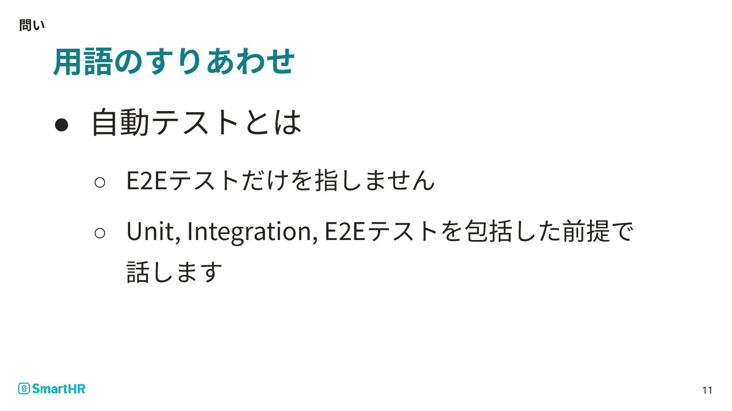 問い 11 ⽤語のすりあわせ • ⾃動テストとは ◦ E2Eテストだけを指しません ◦ Unit, Integration,