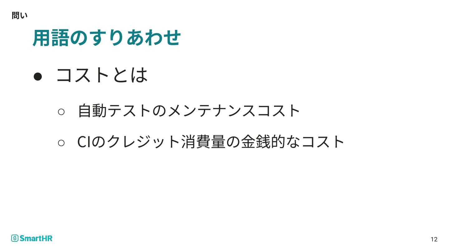問い 12 ⽤語のすりあわせ • コストとは ◦ ⾃動テストのメンテナンスコスト ◦ CIのクレジット消費量の⾦銭的なコスト