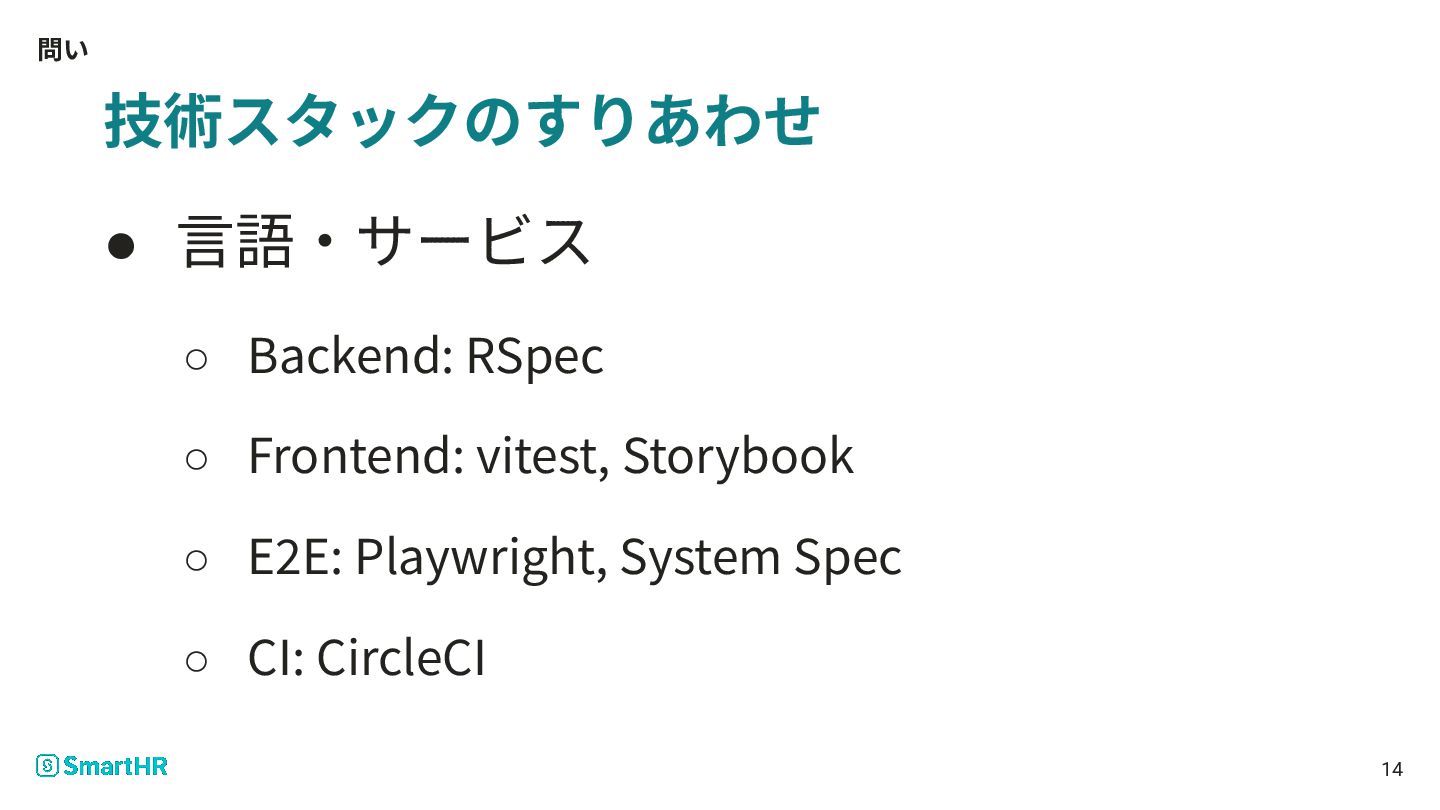 問い 14 技術スタックのすりあわせ • ⾔語‧サービス ◦ Backend: RSpec ◦ Frontend: