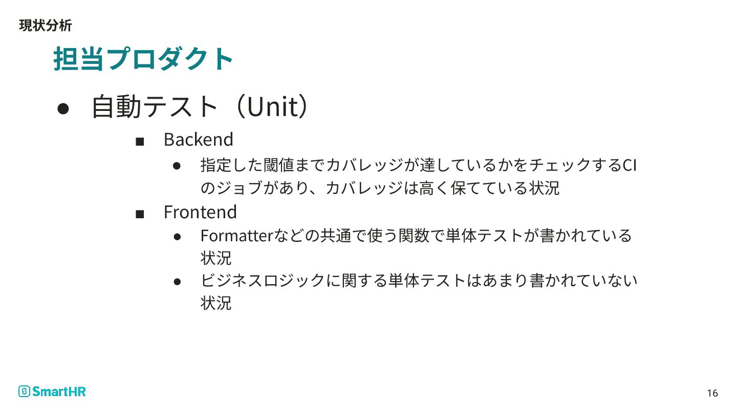 ▪ Frontend • Formatterなどの共通で使う関数で単体テストが書かれている 状況 • ビジネスロジックに関する単体テストはあまり書かれていない 状況