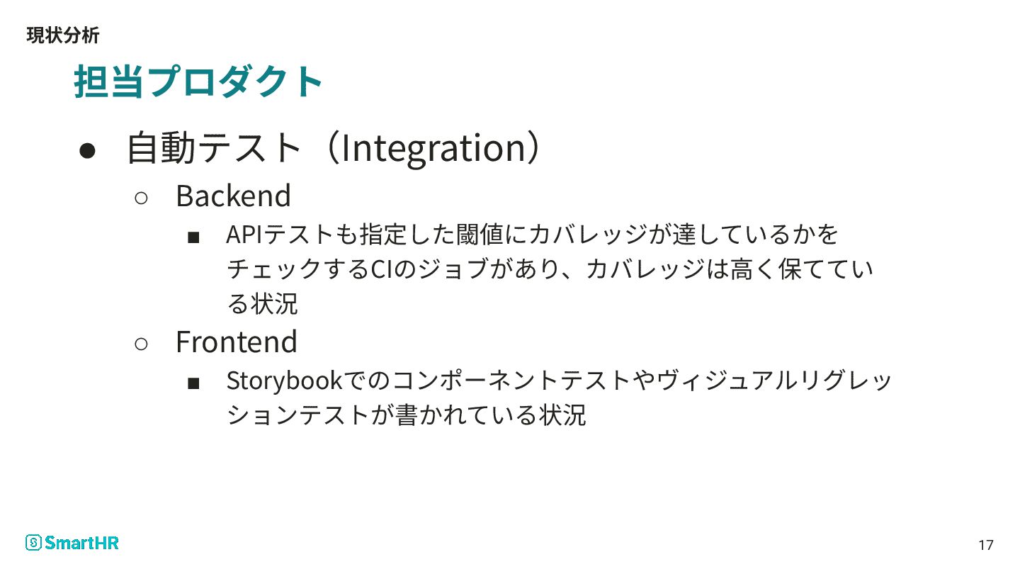 現状分析 16 担当プロダクト • ⾃動テスト(Unit) ▪ Backend • 指定した閾値までカバレッジが達しているかをチェックするCI のジョブがあり、カバレッジは⾼く保てている状況