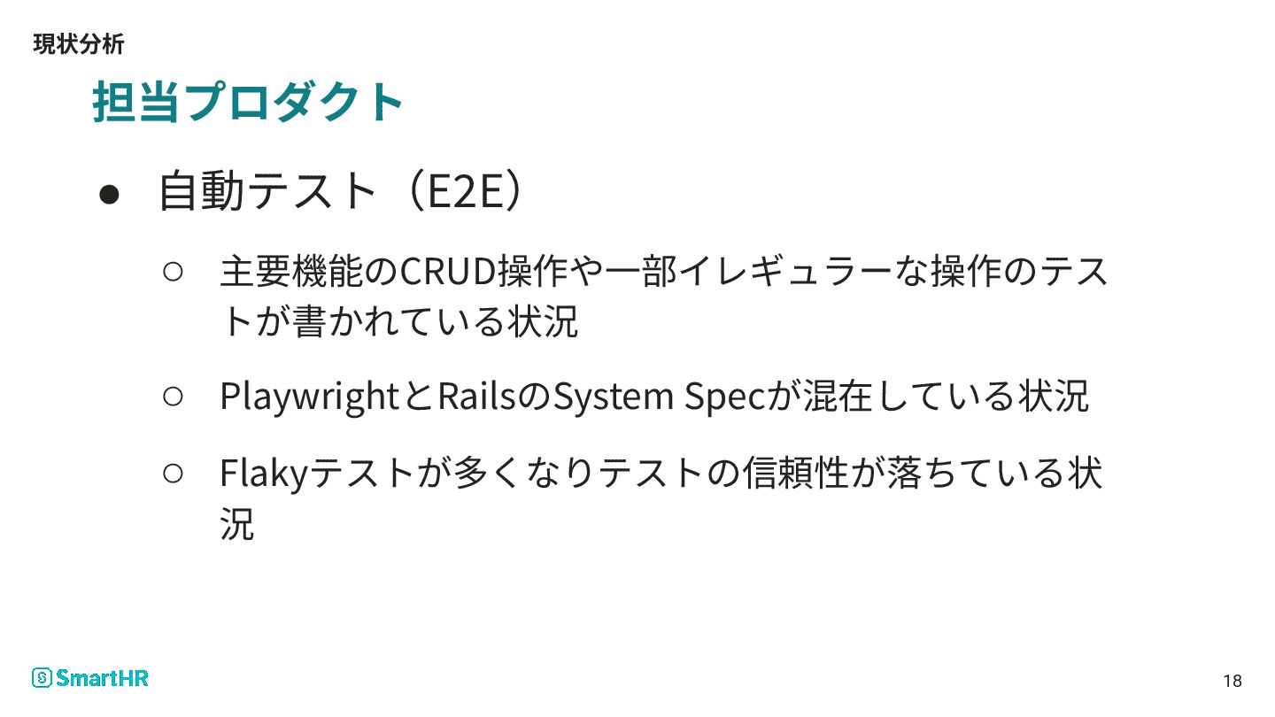 現状分析 18 担当プロダクト • ⾃動テスト(E2E) ◦ 主要機能のCRUD操作や⼀部イレギュラーな操作のテス トが書かれている状況 ◦ PlaywrightとRailsのSystem