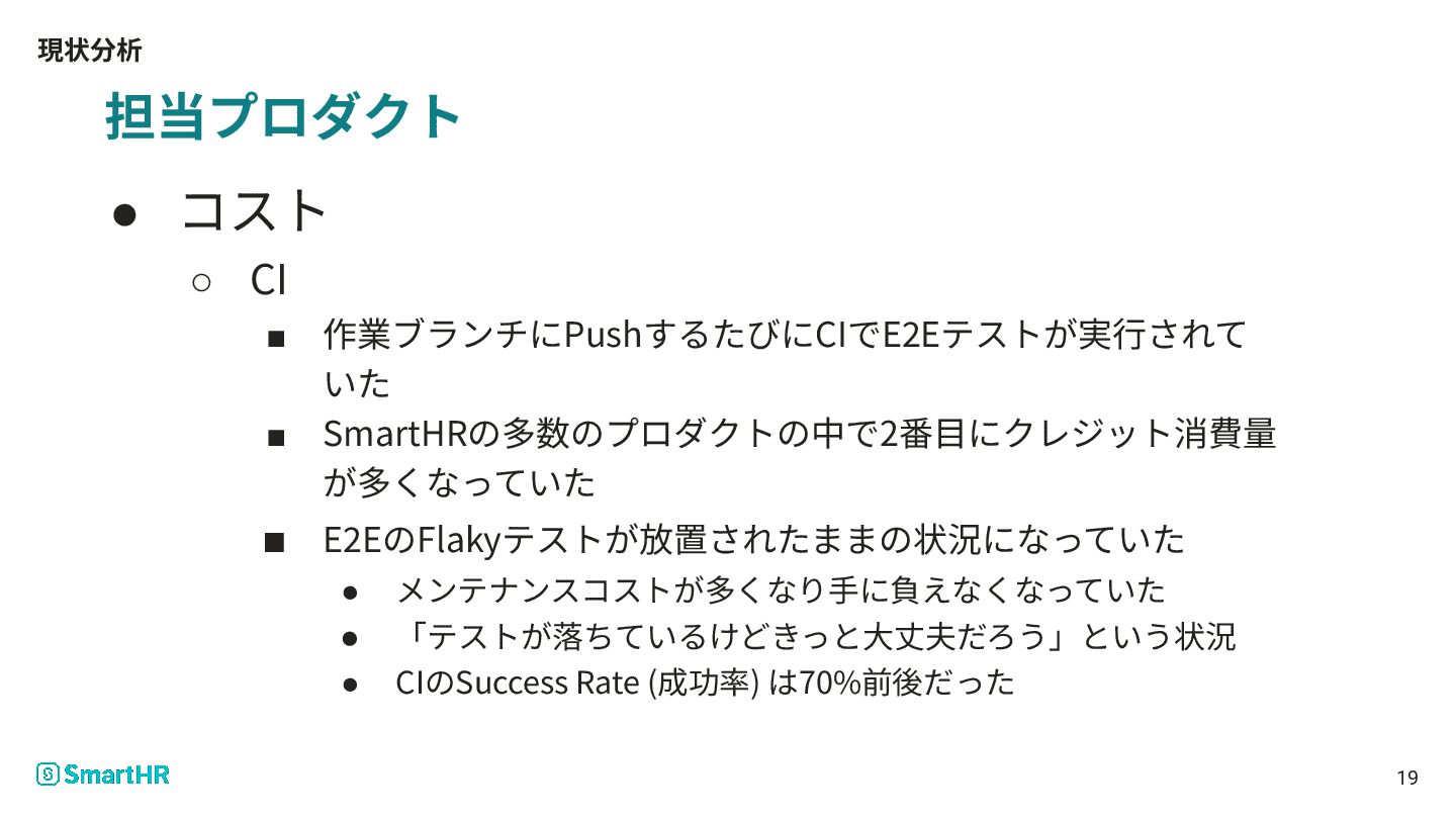 ▪ SmartHRの多数のプロダクトの中で2番⽬にクレジット消費量 が多くなっていた ▪ E2EのFlakyテストが放置されたままの状況になっていた • メンテナンスコストが多くなり⼿に負えなくなっていた • 「テストが落ちているけどきっと⼤丈夫だろう」という状況 • CIのSuccess Rate (成功率) は70%前後だった
