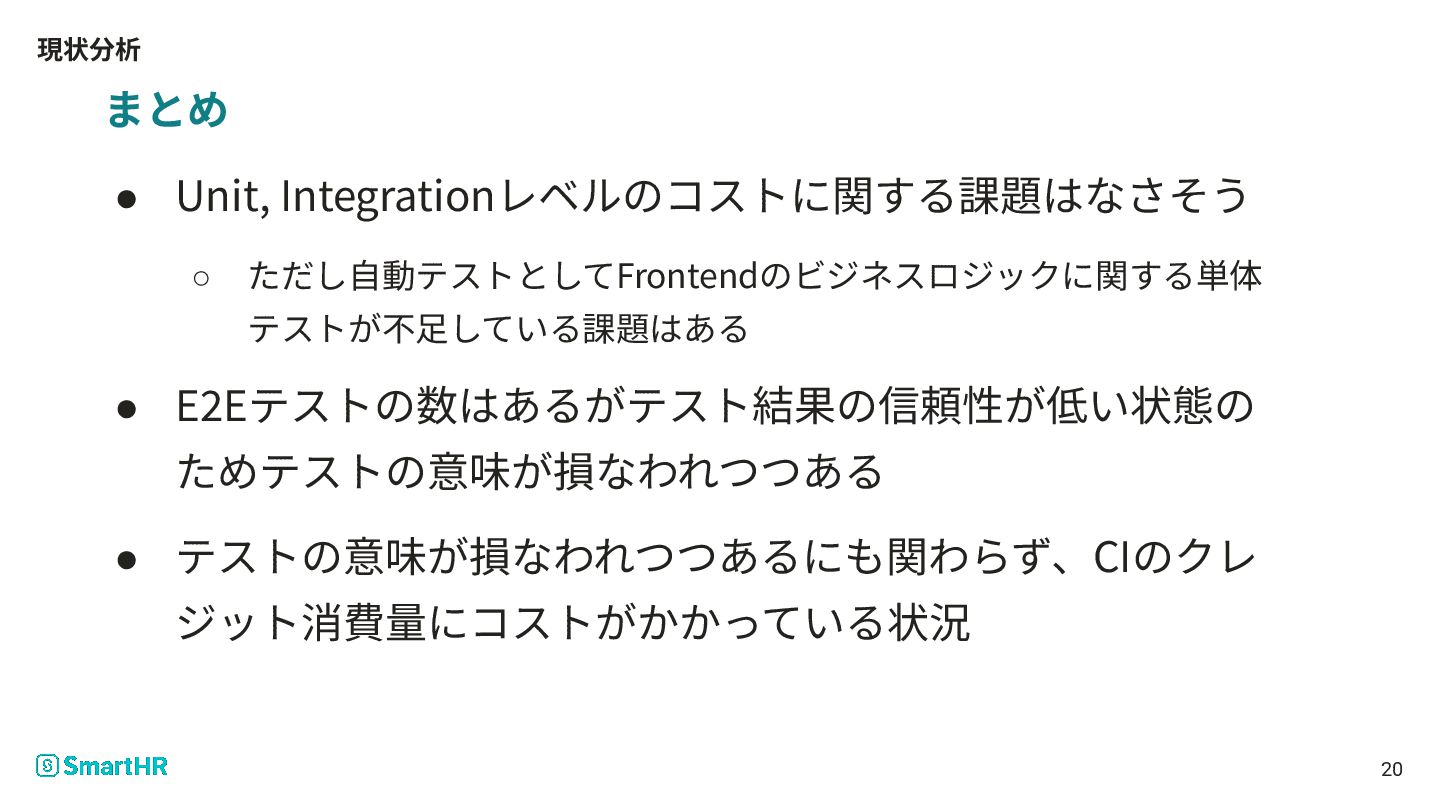現状分析 20 まとめ • Unit, Integrationレベルのコストに関する課題はなさそう ◦ ただし⾃動テストとしてFrontendのビジネスロジックに関する単体 テストが不⾜している課題はある •
