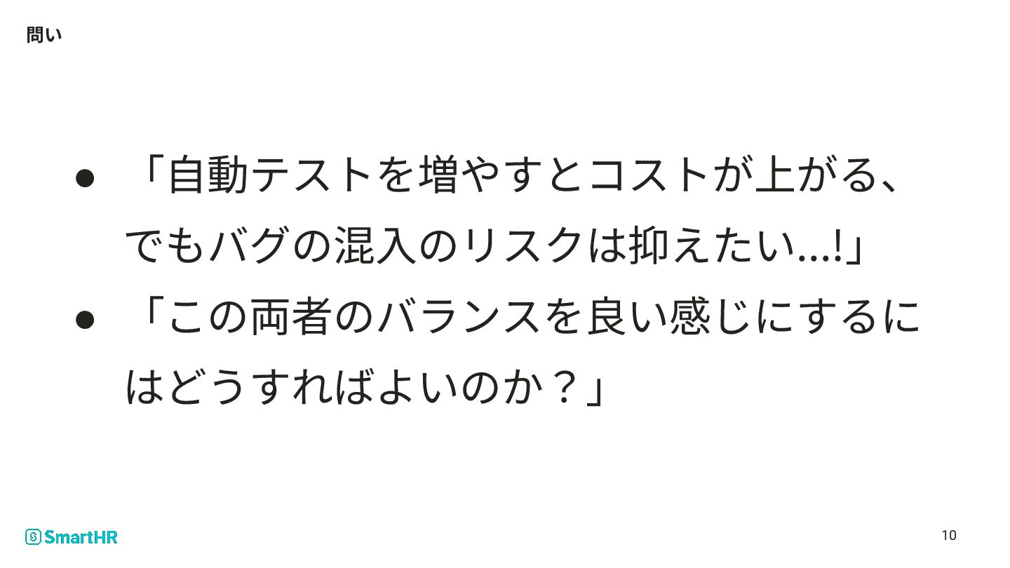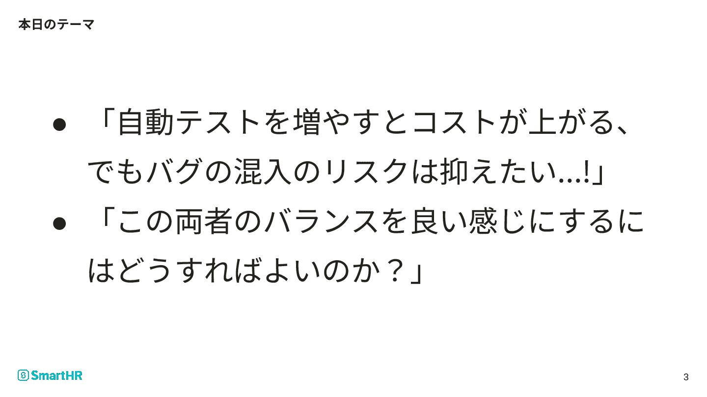 本⽇のテーマ • 「⾃動テストを増やすとコストが上がる、 でもバグの混⼊のリスクは抑えたい...!」 • 「この両者のバランスを良い感じにするに はどうすればよいのか?」 3