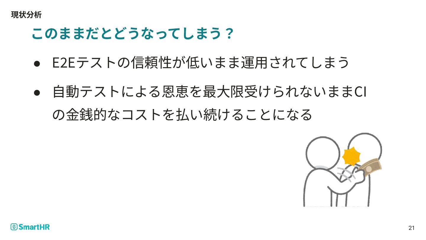 現状分析 21 このままだとどうなってしまう? • E2Eテストの信頼性が低いまま運⽤されてしまう • ⾃動テストによる恩恵を最⼤限受けられないままCI の⾦銭的なコストを払い続けることになる
