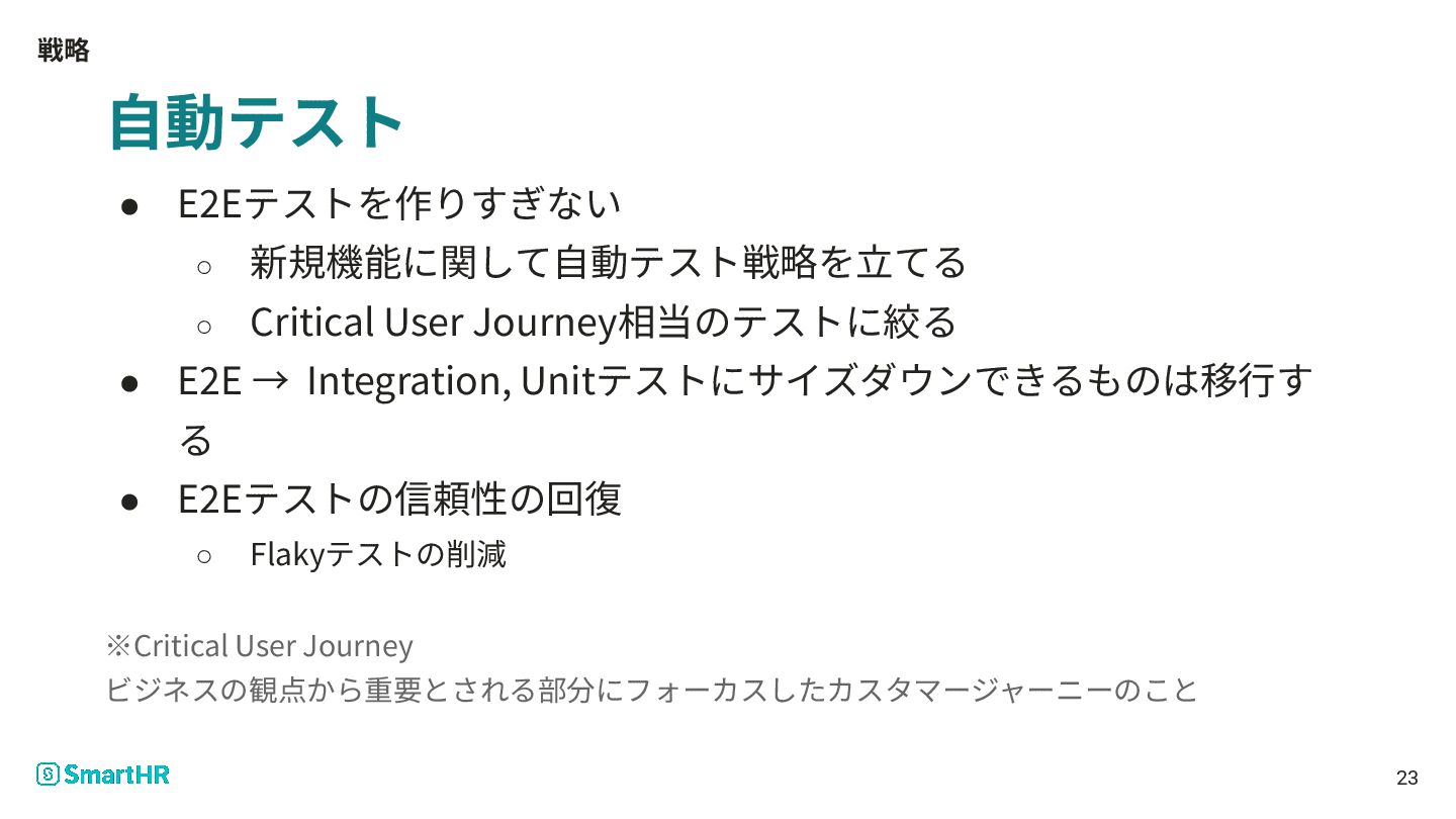 戦略 23 ⾃動テスト • E2Eテストを作りすぎない ◦ 新規機能に関して⾃動テスト戦略を⽴てる ◦ Critical User