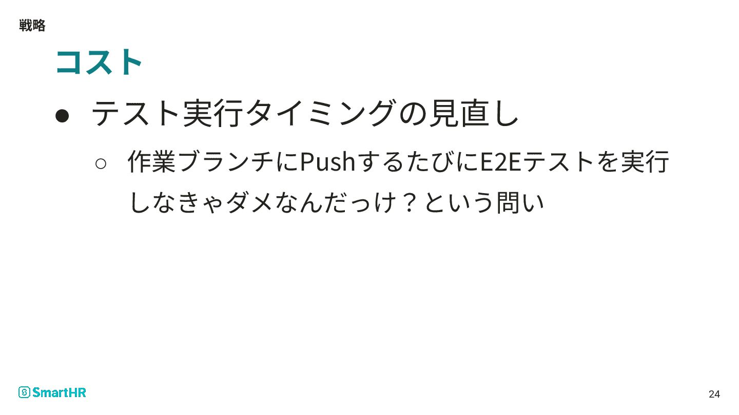 戦略 24 コスト • テスト実⾏タイミングの⾒直し ◦ 作業ブランチにPushするたびにE2Eテストを実⾏ しなきゃダメなんだっけ?という問い