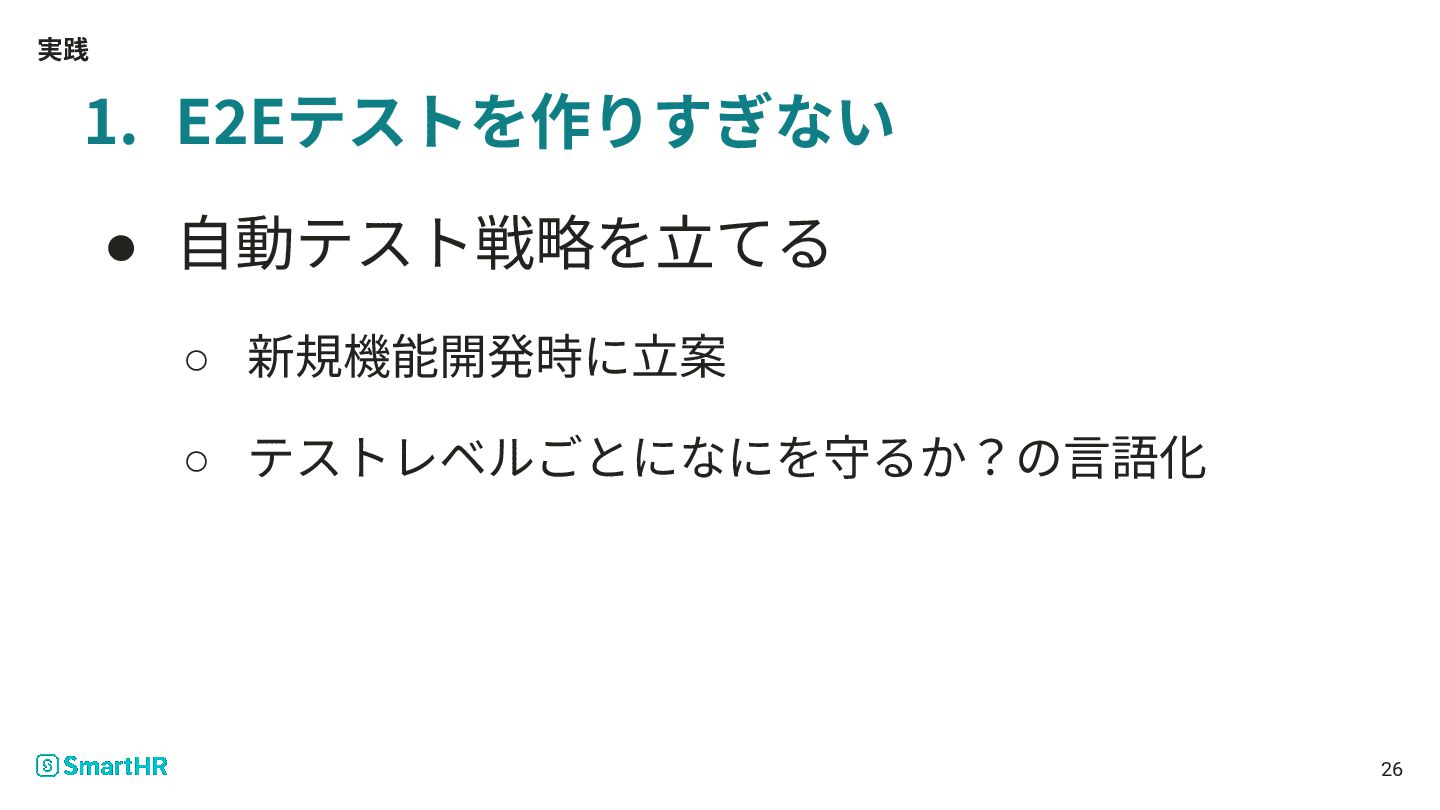 実践 1. E2Eテストを作りすぎない • ⾃動テスト戦略を⽴てる ◦ 新規機能開発時に⽴案 ◦ テストレベルごとになにを守るか?の⾔語化 26
