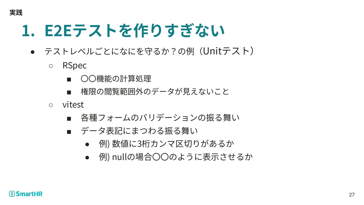 実践 1. E2Eテストを作りすぎない • テストレベルごとになにを守るか?の例(Unitテスト) ◦ RSpec ▪ 〇〇機能の計算処理 ▪