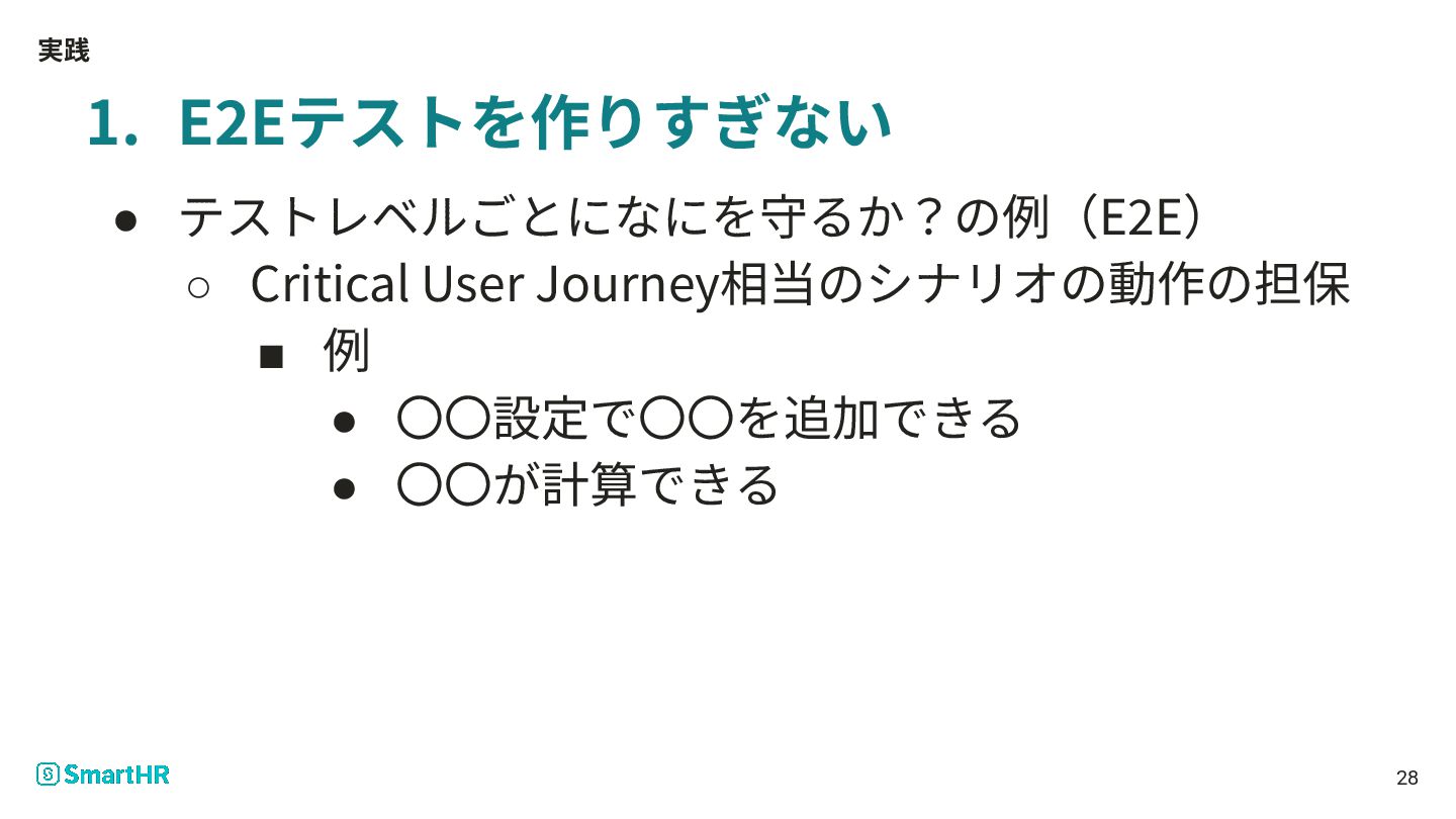 実践 1. E2Eテストを作りすぎない • テストレベルごとになにを守るか?の例(E2E) ◦ Critical User Journey相当のシナリオの動作の担保 ▪