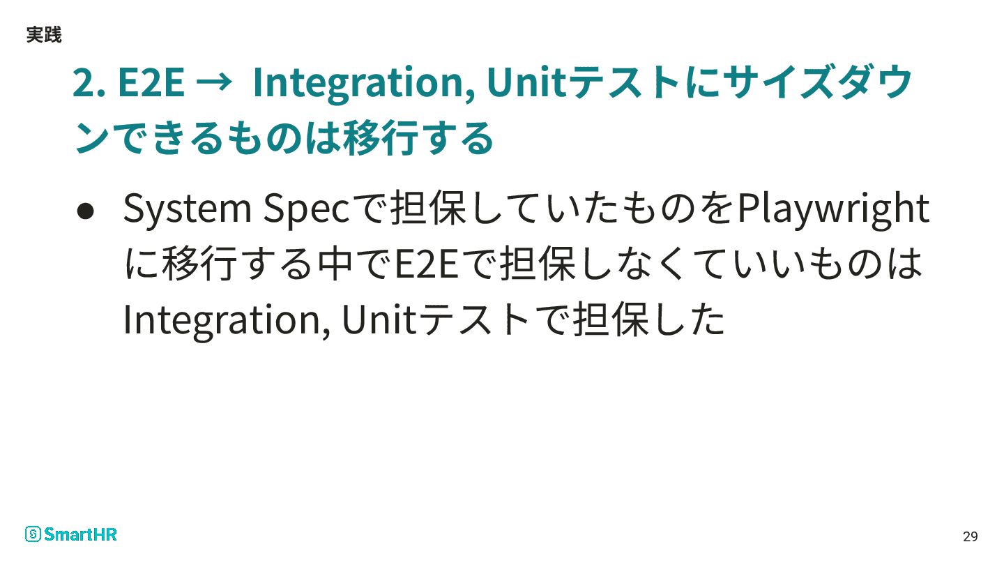 実践 2. E2E → Integration, Unitテストにサイズダウ ンできるものは移⾏する • System Specで担保していたものをPlaywright