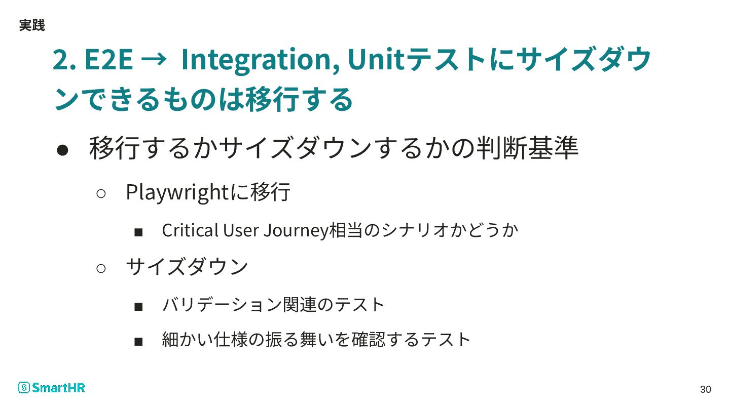 実践 2. E2E → Integration, Unitテストにサイズダウ ンできるものは移⾏する • 移⾏するかサイズダウンするかの判断基準 ◦