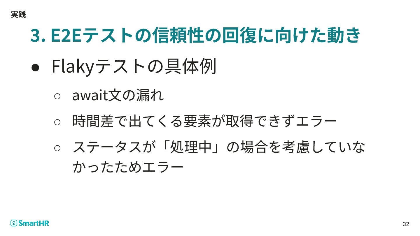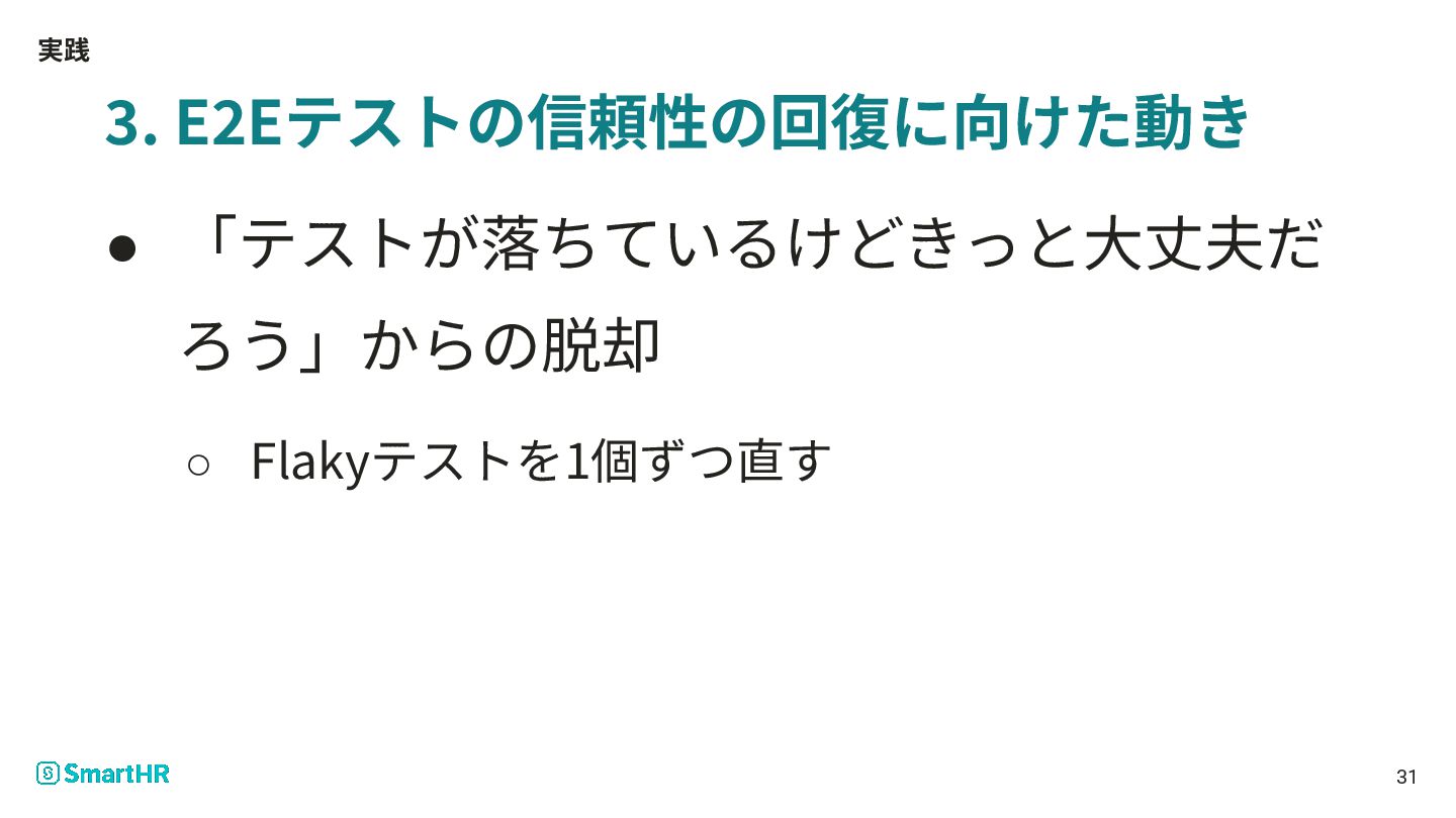 実践 3. E2Eテストの信頼性の回復に向けた動き • 「テストが落ちているけどきっと⼤丈夫だ ろう」からの脱却 ◦ Flakyテストを1個ずつ直す 31