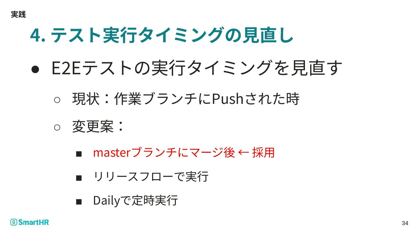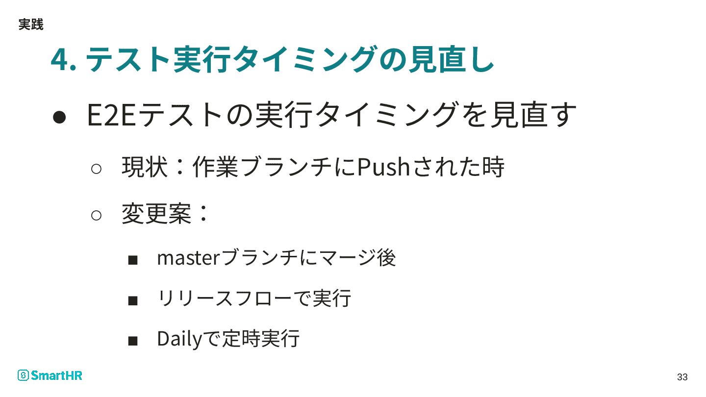 実践 4. テスト実⾏タイミングの⾒直し • E2Eテストの実⾏タイミングを⾒直す ◦ 現状:作業ブランチにPushされた時 ◦ 変更案: ▪