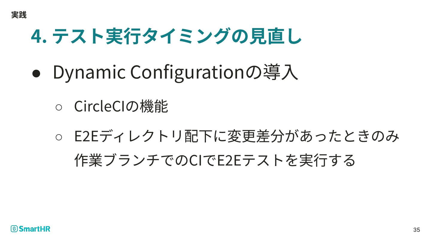 実践 4. テスト実⾏タイミングの⾒直し • Dynamic Configurationの導⼊ ◦ CircleCIの機能 ◦ E2Eディレクトリ配下に変更差分があったときのみ