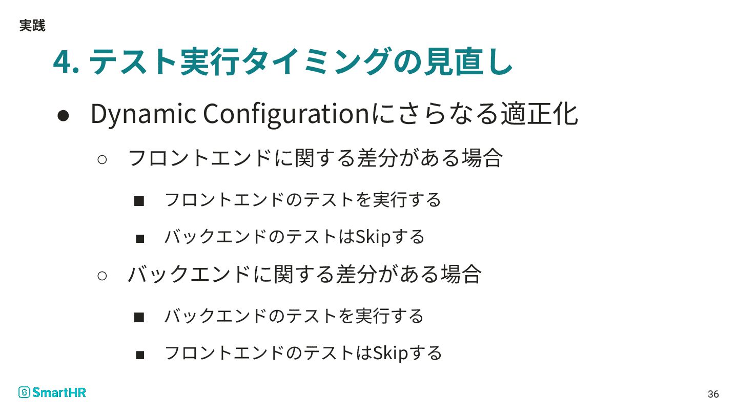 実践 4. テスト実⾏タイミングの⾒直し • Dynamic Configurationにさらなる適正化 ◦ フロントエンドに関する差分がある場合 ▪ フロントエンドのテストを実⾏する