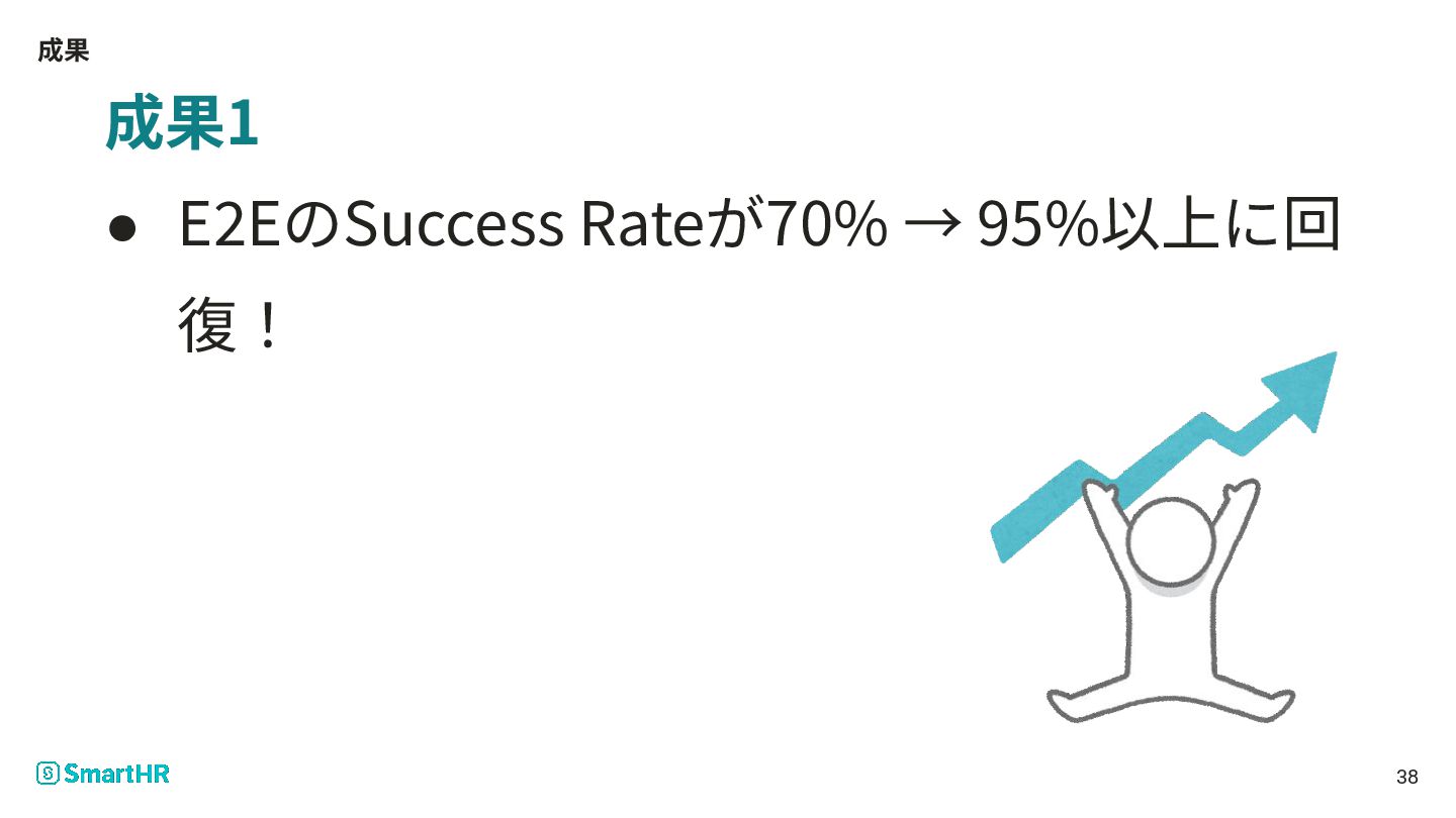 成果 成果1 • E2EのSuccess Rateが70% → 95%以上に回 復! 38