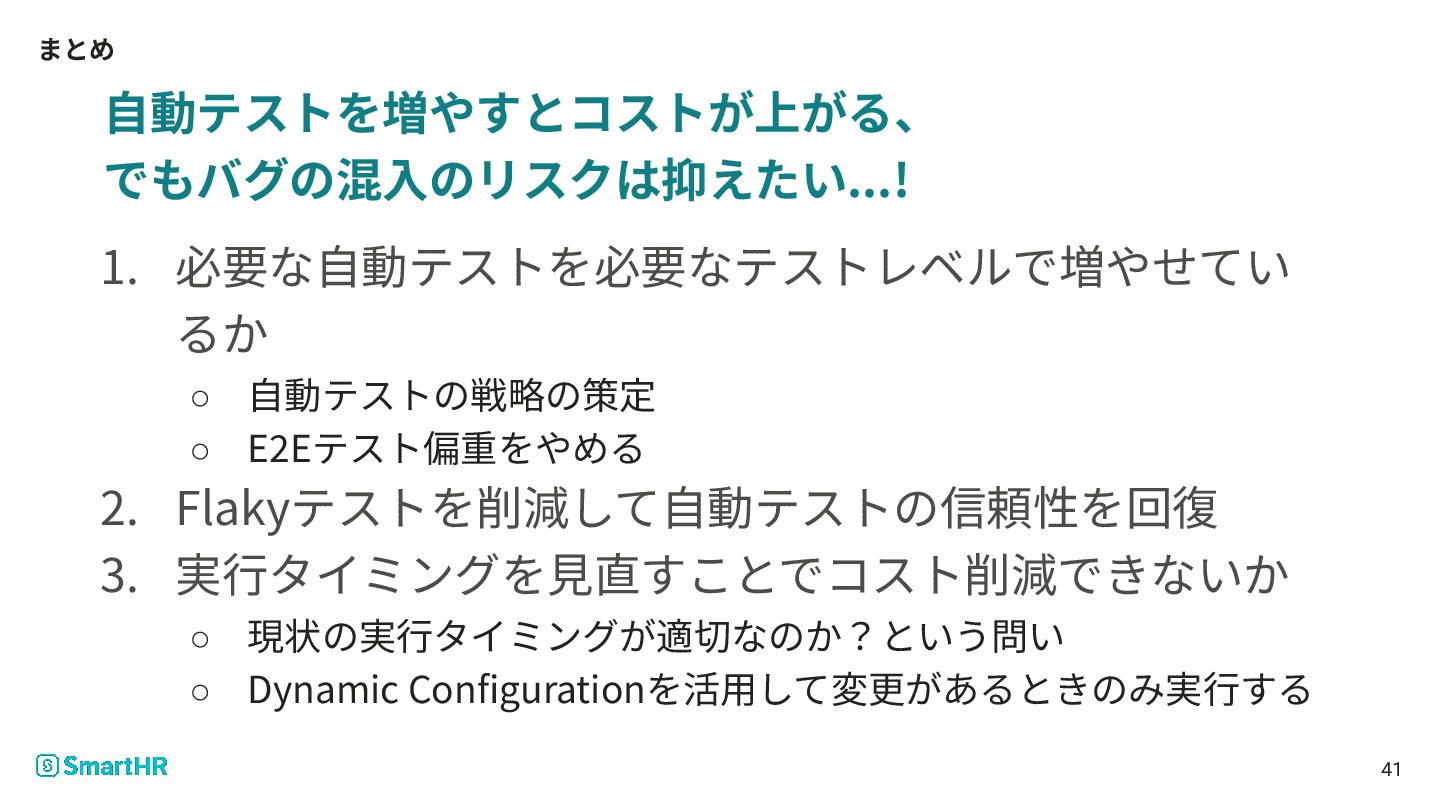 E2Eテスト偏重をやめる 2. Flakyテストを削減して⾃動テストの信頼性を回復 3. 実⾏タイミングを⾒直すことでコスト削減できないか ◦ 現状の実⾏タイミングが適切なのか?という問い ◦ Dynamic Configurationを活⽤して変更があるときのみ実⾏する