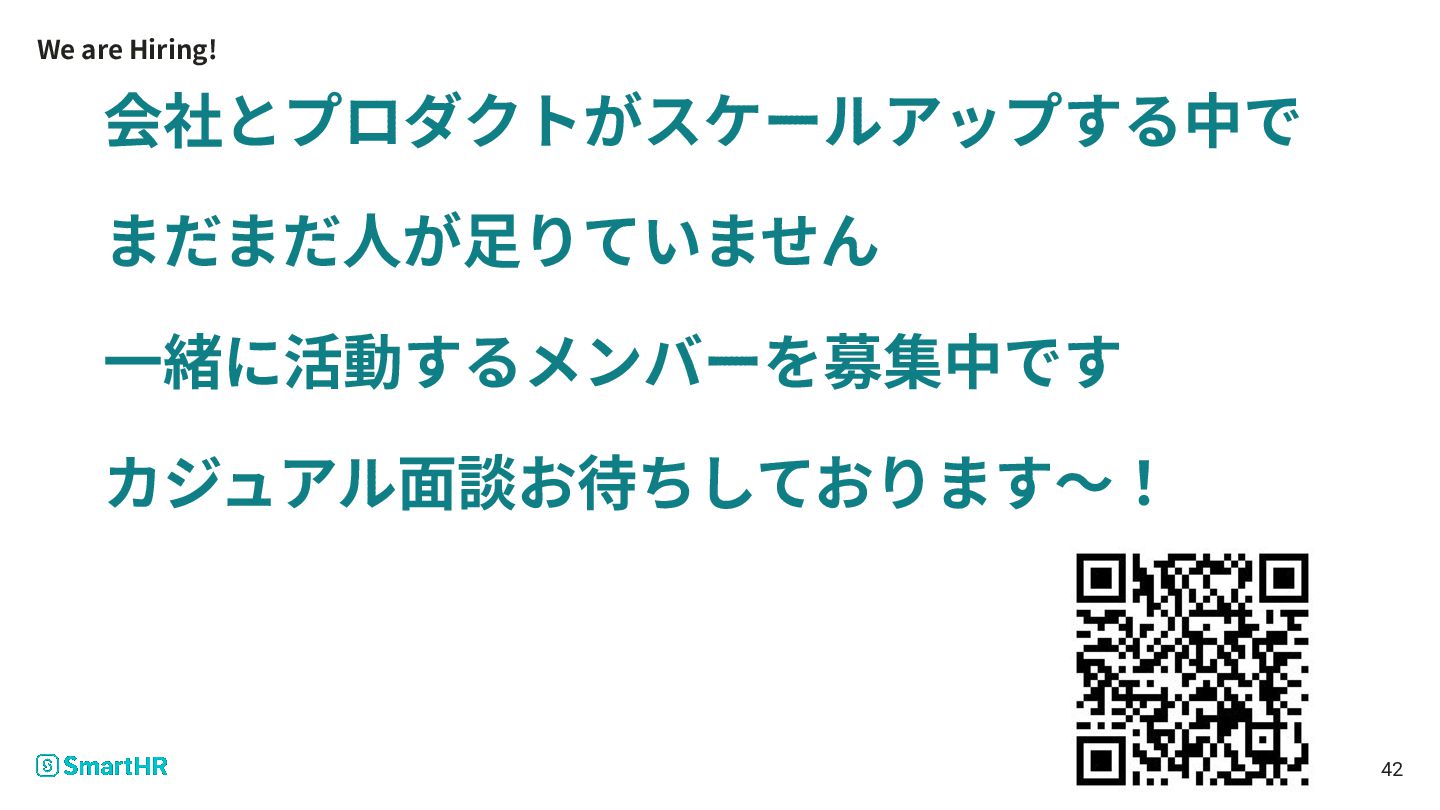 We are Hiring! 会社とプロダクトがスケールアップする中で まだまだ⼈が⾜りていません ⼀緒に活動するメンバーを募集中です カジュアル⾯談お待ちしております〜! 42