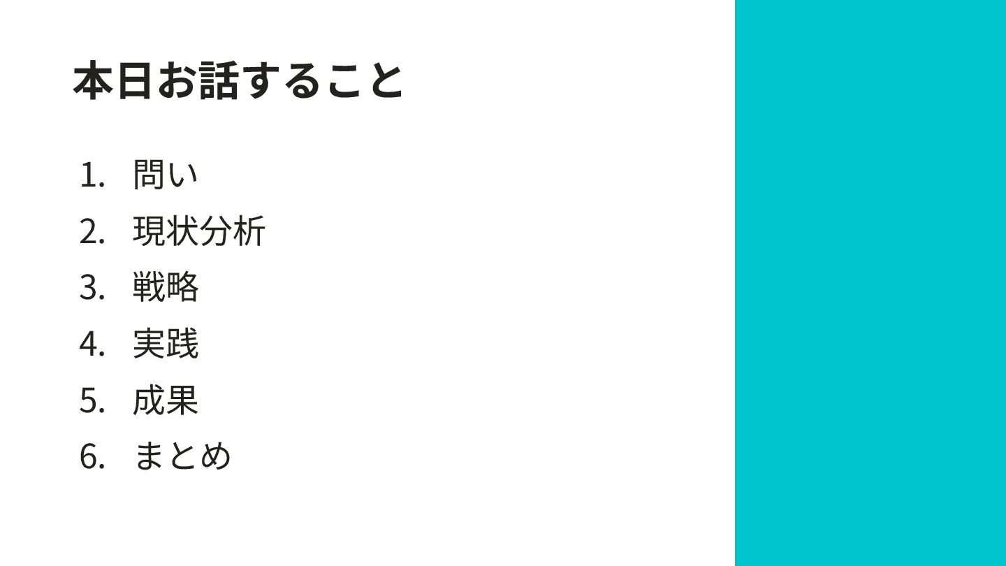 本⽇お話すること 1. 問い 2. 現状分析 3. 戦略 4. 実践 5.