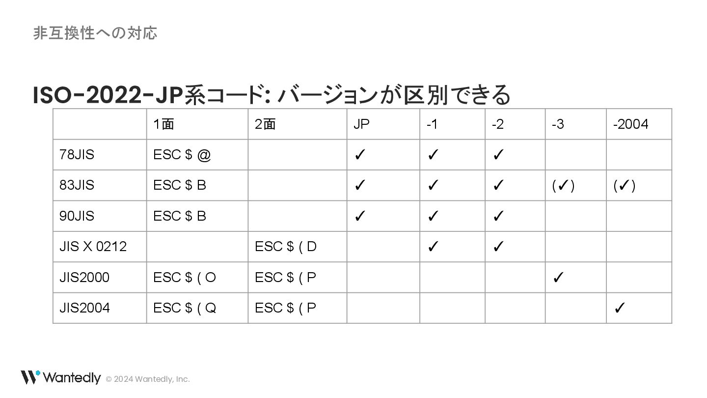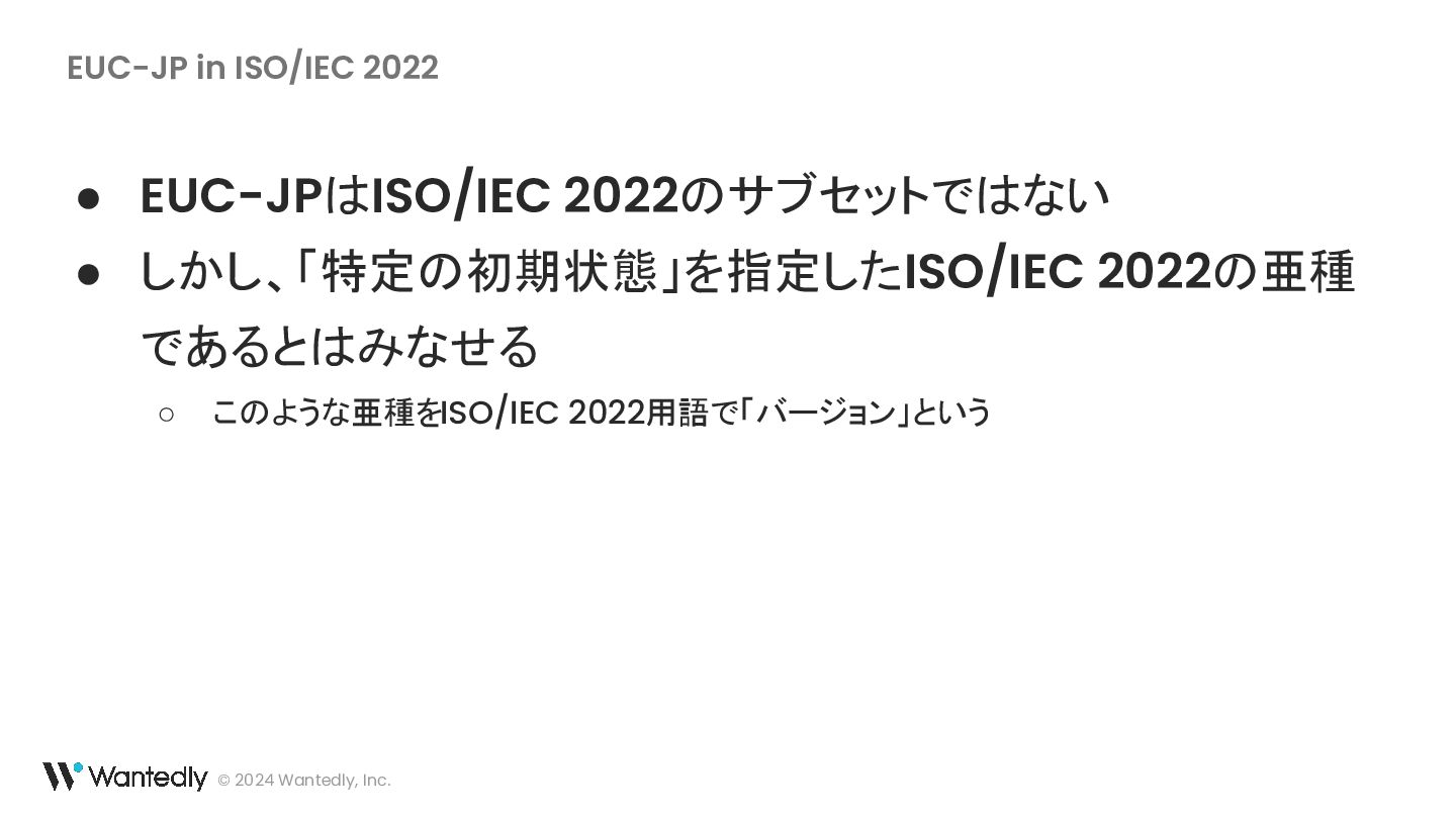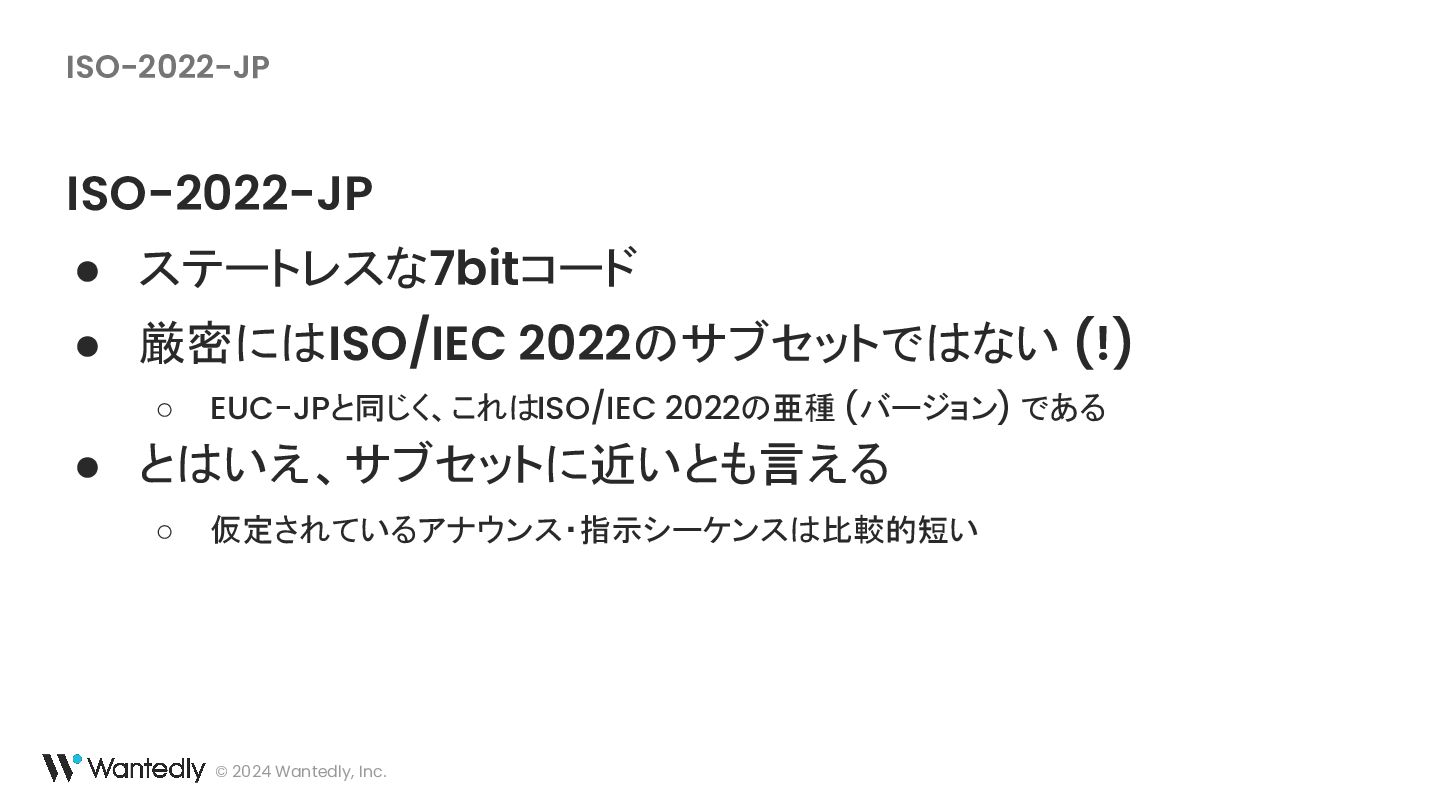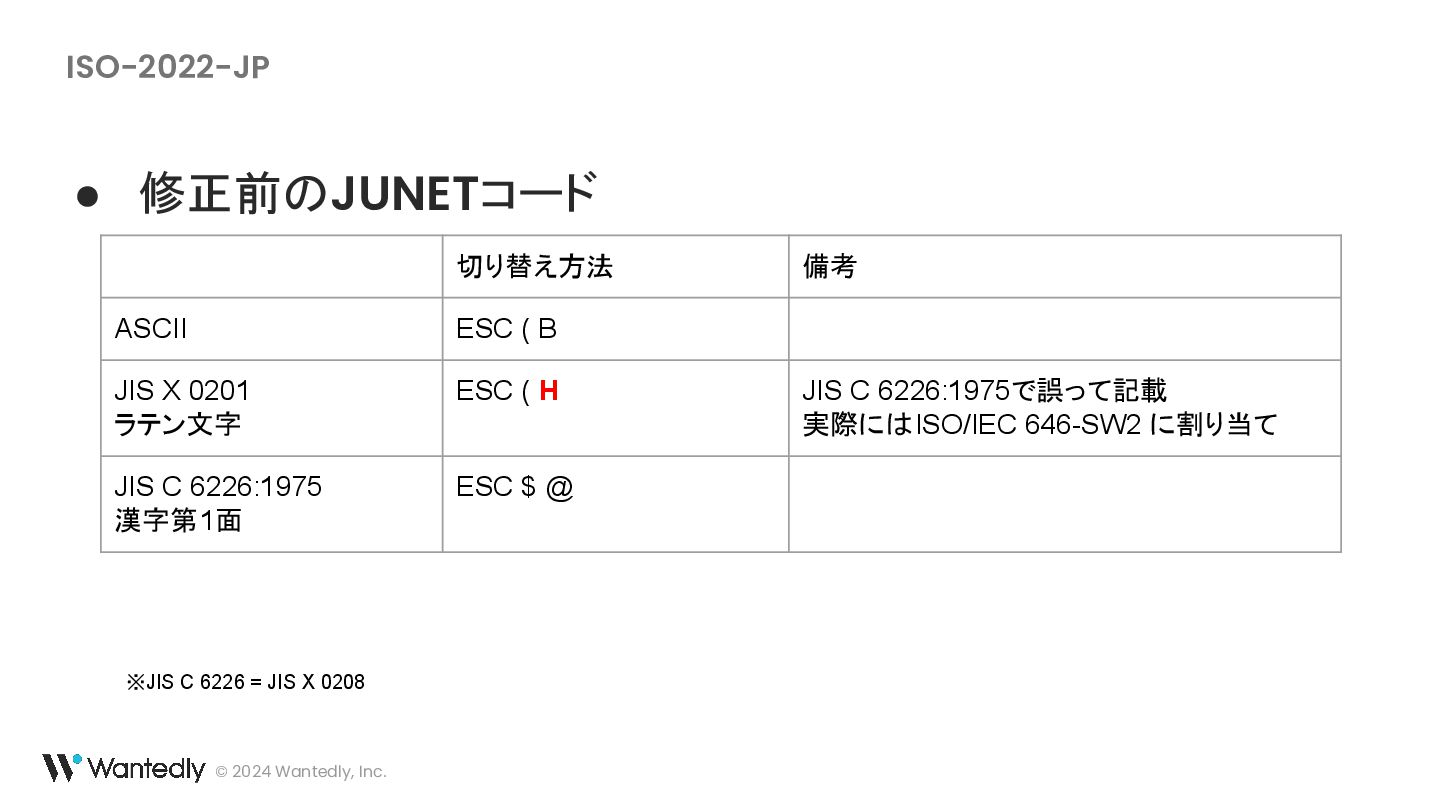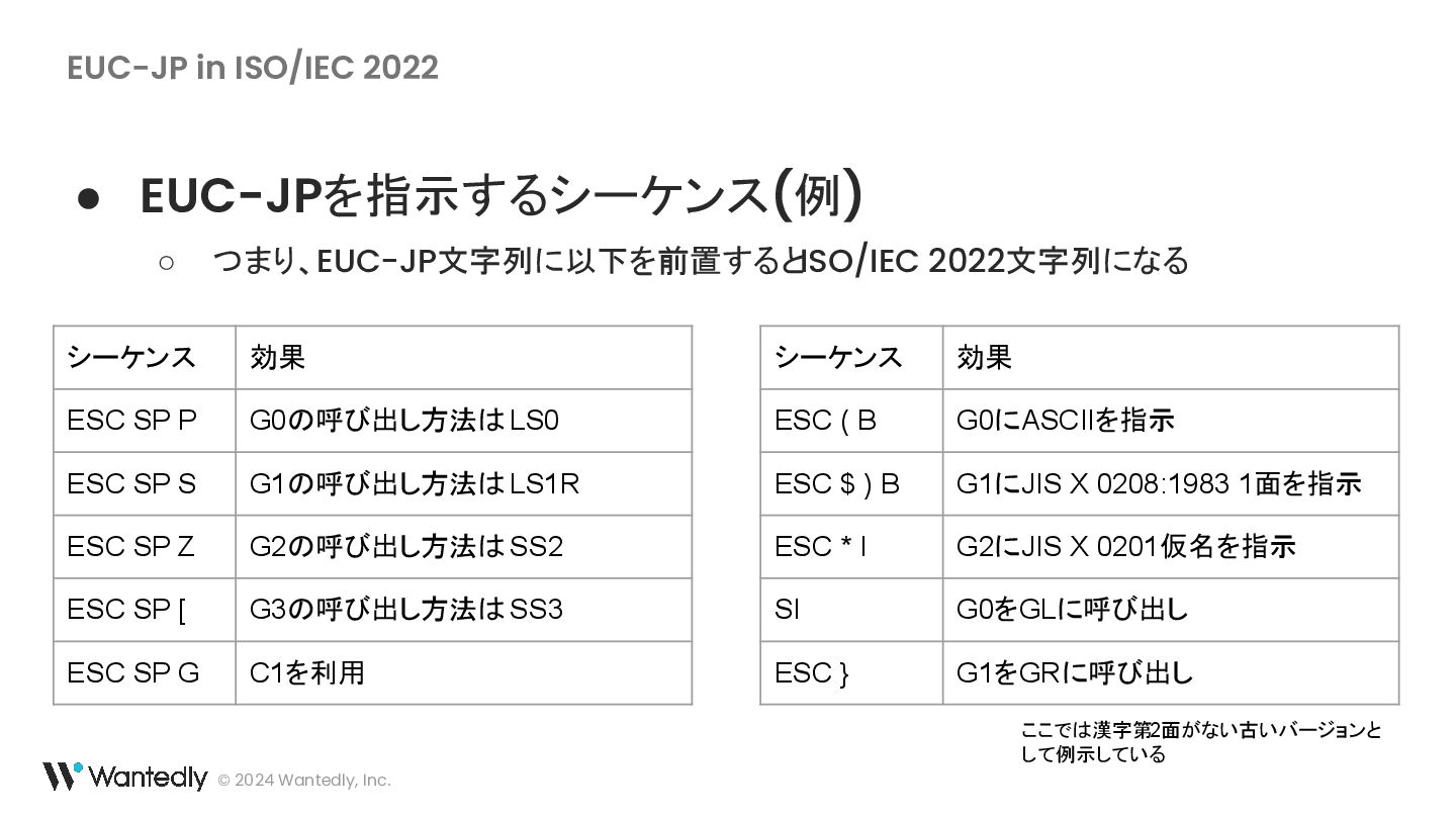 結果として、文字集合のバージョン差異に対しても厳密に動作する ◦ ASCIIと JIS X 0201 ラテン文字用文字集合も区別できる ◦ 初期版では漢字集合をJIS78とJIS83から選択可能 • JIS X 0201 仮名文字 (いわゆる半角カナ) は使わない ◦ ISO/IEC 2022上は ESC ( I で指示できるため、非公式に対応しているケースもある