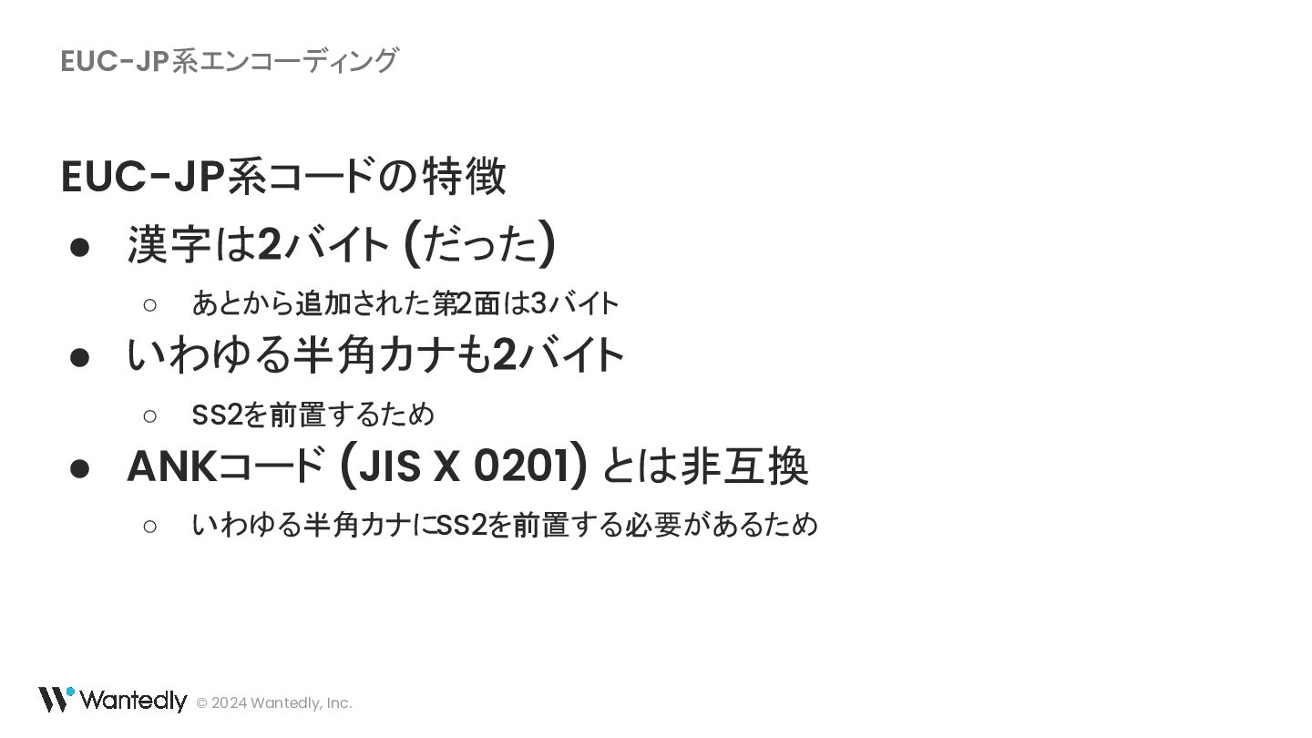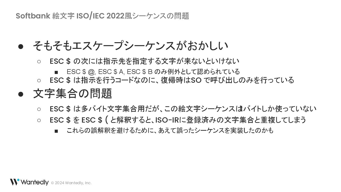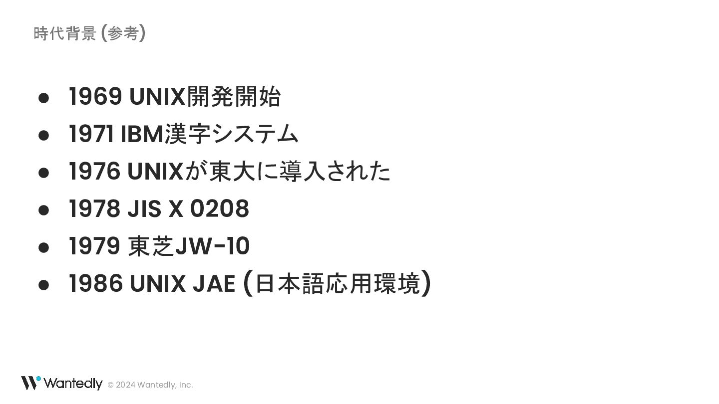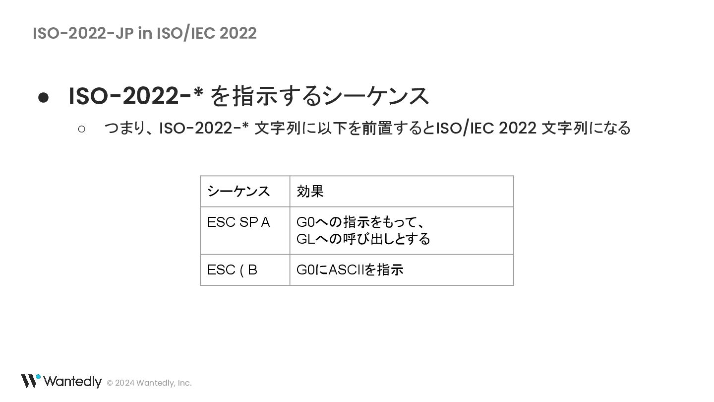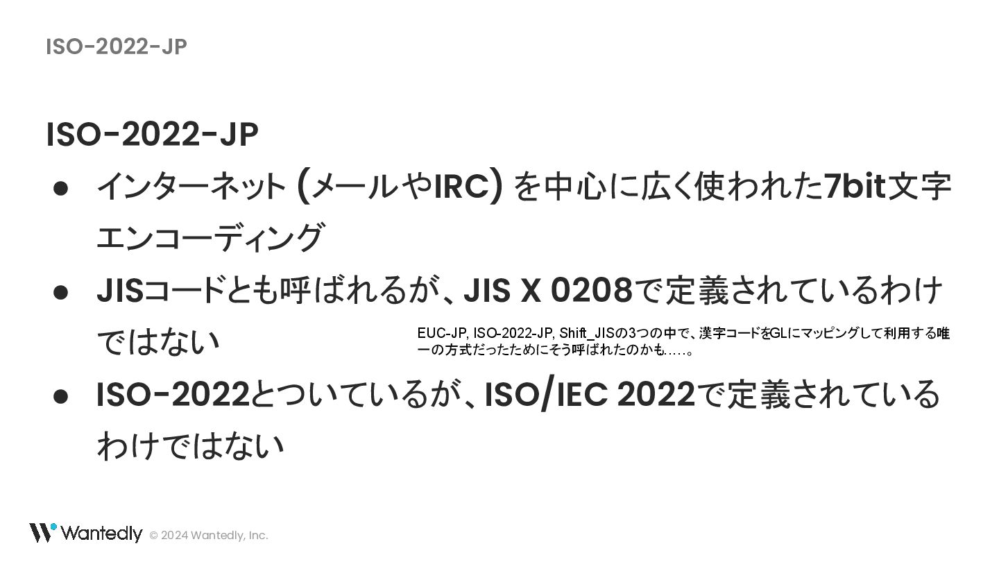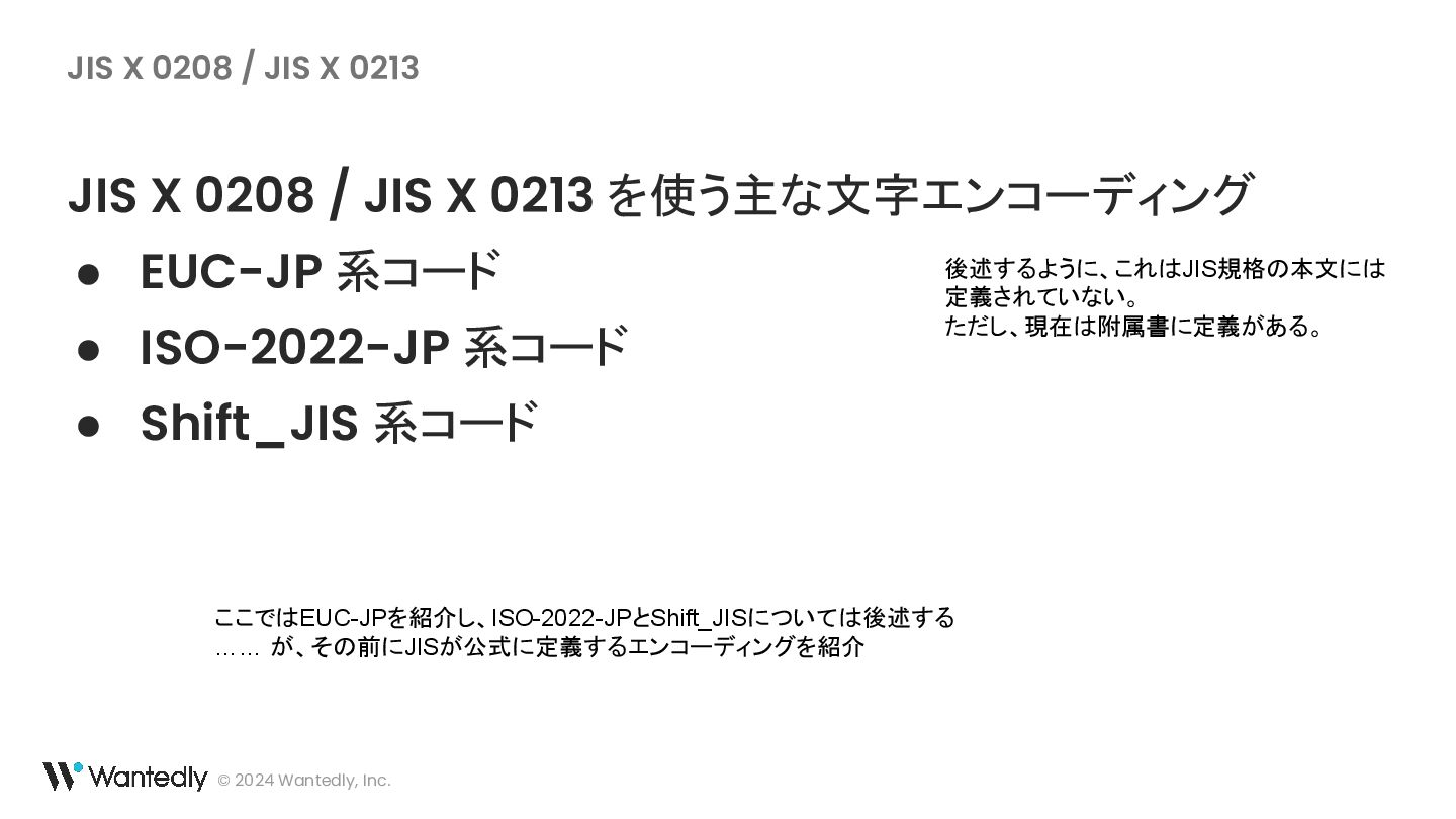 結果として、文字集合のバージョン差異に対しても厳密に動作する ◦ ASCIIと JIS X 0201 ラテン文字用文字集合も区別できる ◦ 初期版では漢字集合をJIS78とJIS83から選択可能 • JIS X 0201 仮名文字 (いわゆる半角カナ) は使わない ◦ ISO/IEC 2022上は ESC ( I で指示できるため、非公式に対応しているケースもある