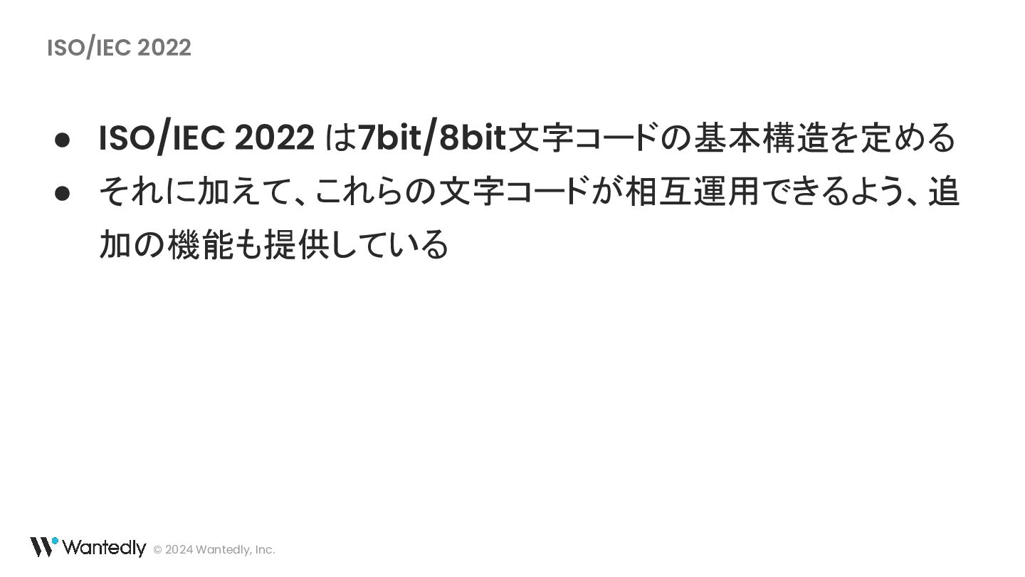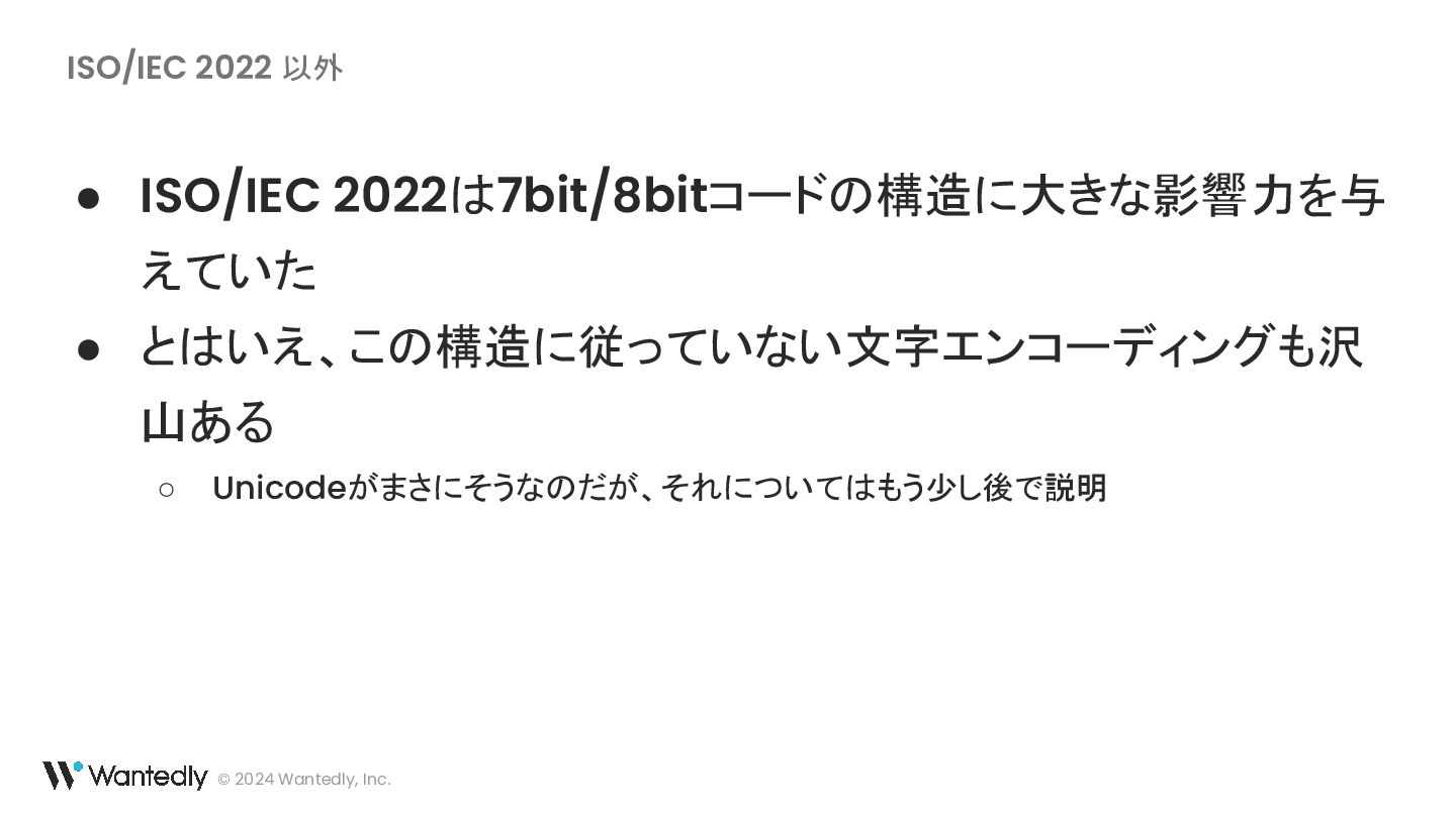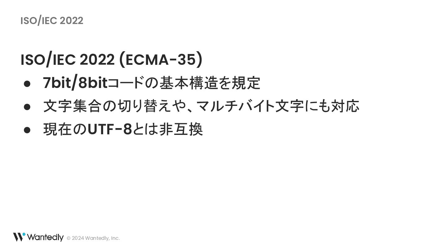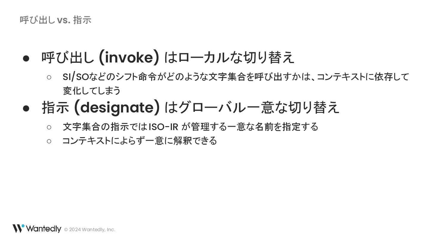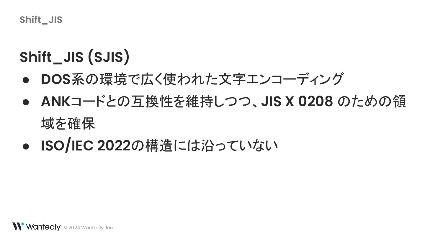 結果として、文字集合のバージョン差異に対しても厳密に動作する ◦ ASCIIと JIS X 0201 ラテン文字用文字集合も区別できる ◦ 初期版では漢字集合をJIS78とJIS83から選択可能 • JIS X 0201 仮名文字 (いわゆる半角カナ) は使わない ◦ ISO/IEC 2022上は ESC ( I で指示できるため、非公式に対応しているケースもある