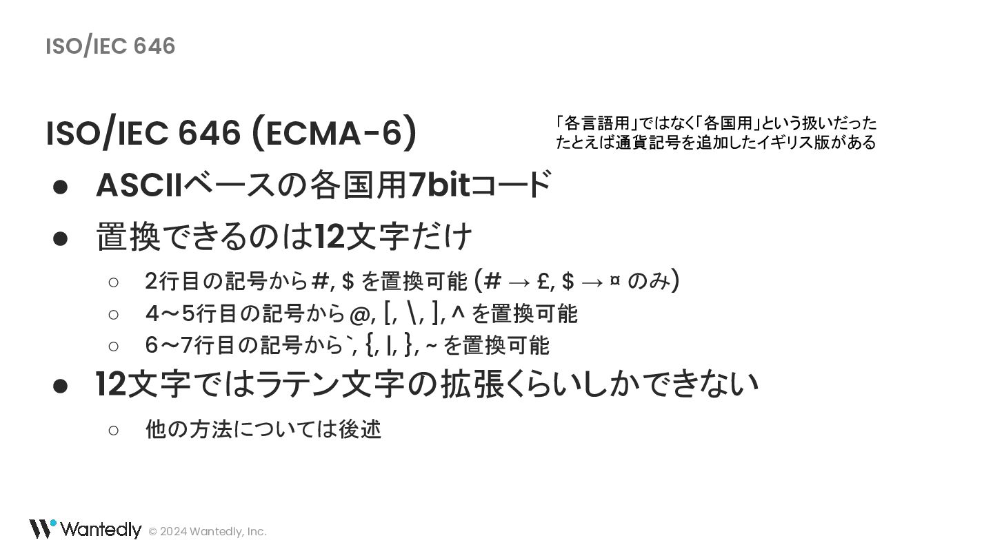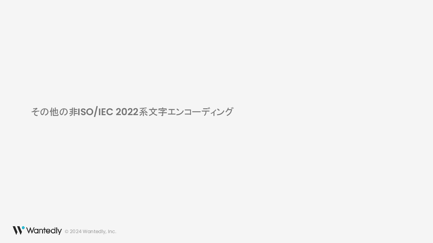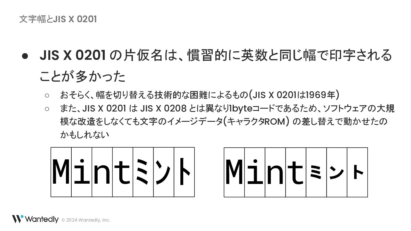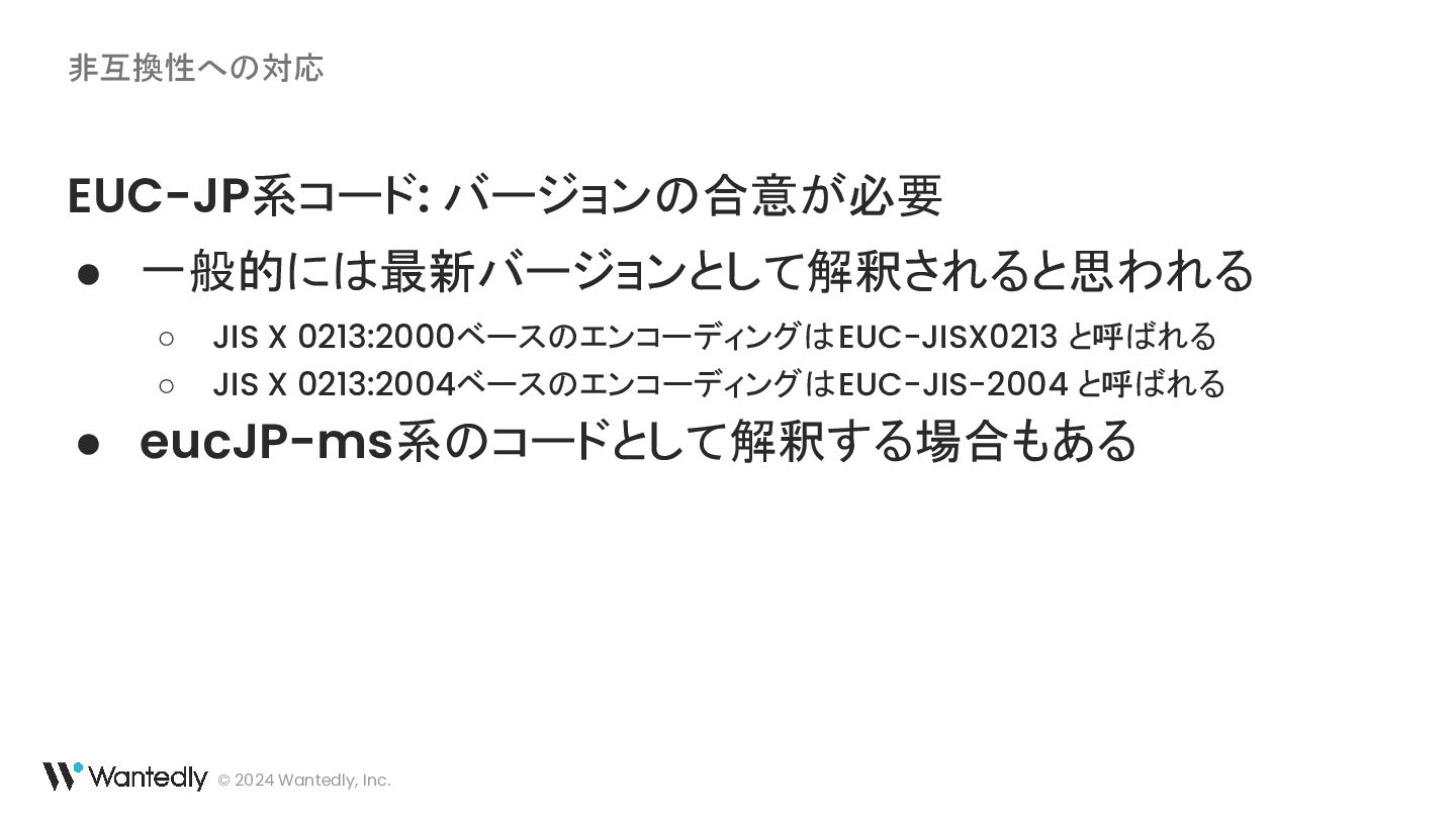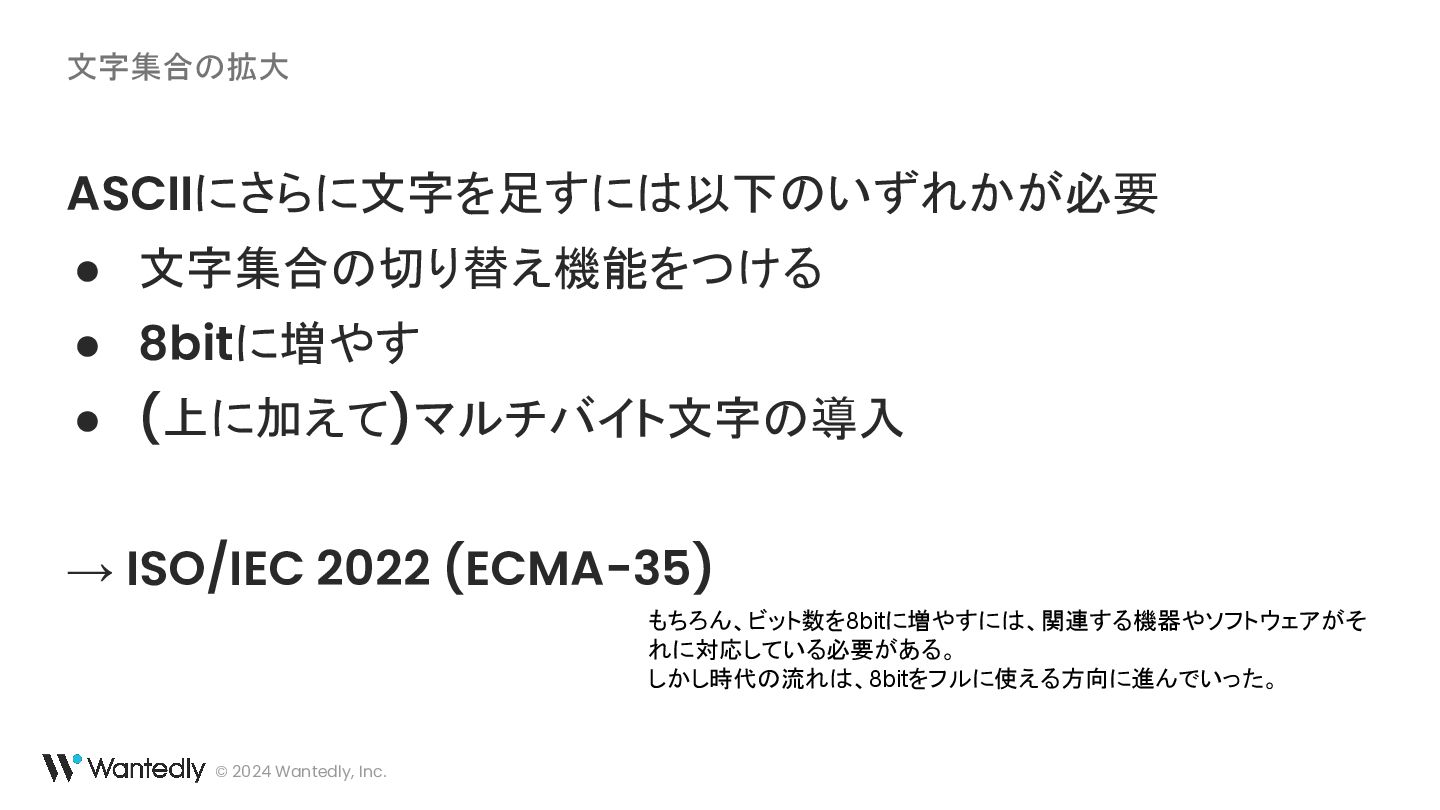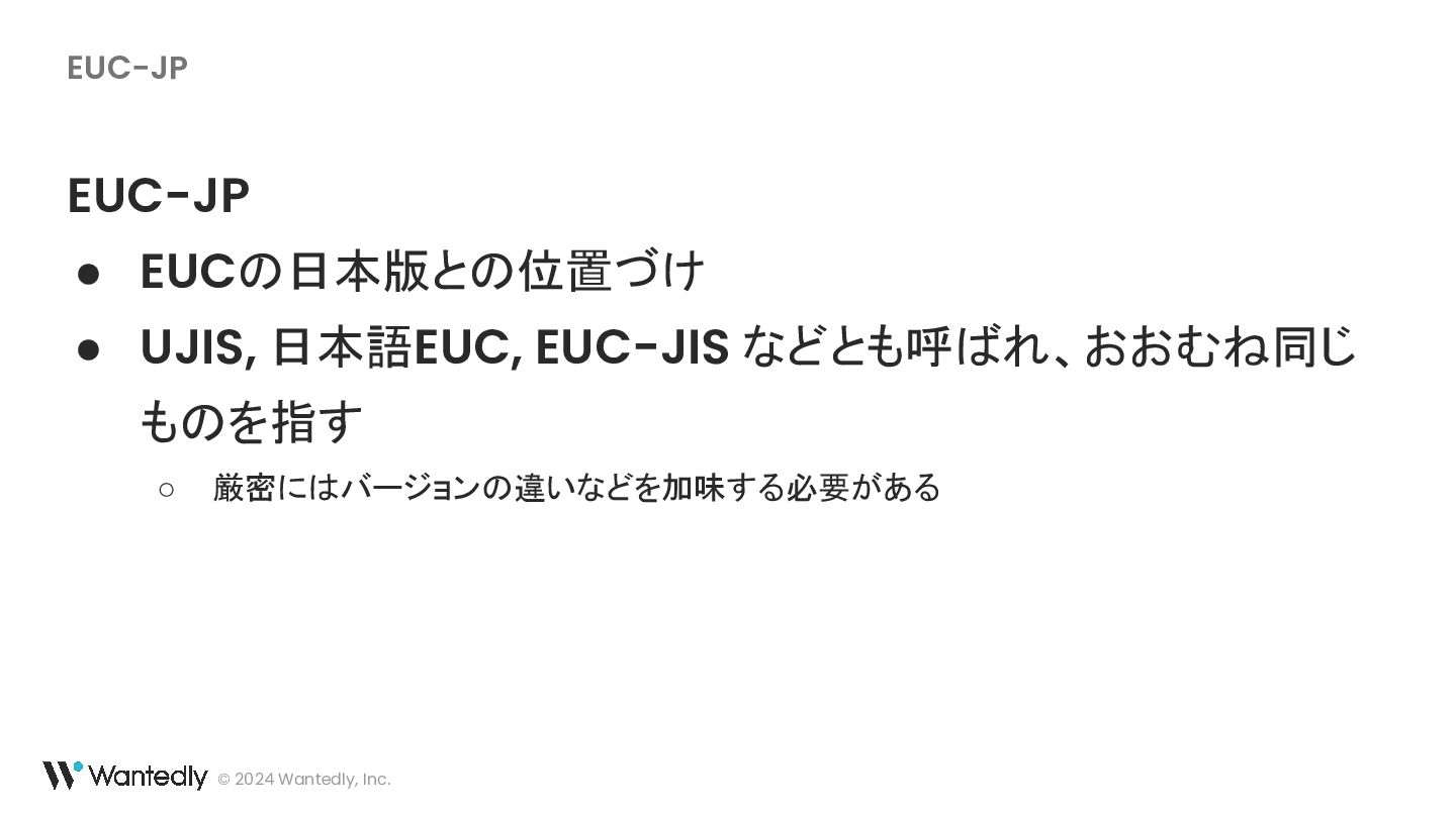 結果として、文字集合のバージョン差異に対しても厳密に動作する ◦ ASCIIと JIS X 0201 ラテン文字用文字集合も区別できる ◦ 初期版では漢字集合をJIS78とJIS83から選択可能 • JIS X 0201 仮名文字 (いわゆる半角カナ) は使わない ◦ ISO/IEC 2022上は ESC ( I で指示できるため、非公式に対応しているケースもある