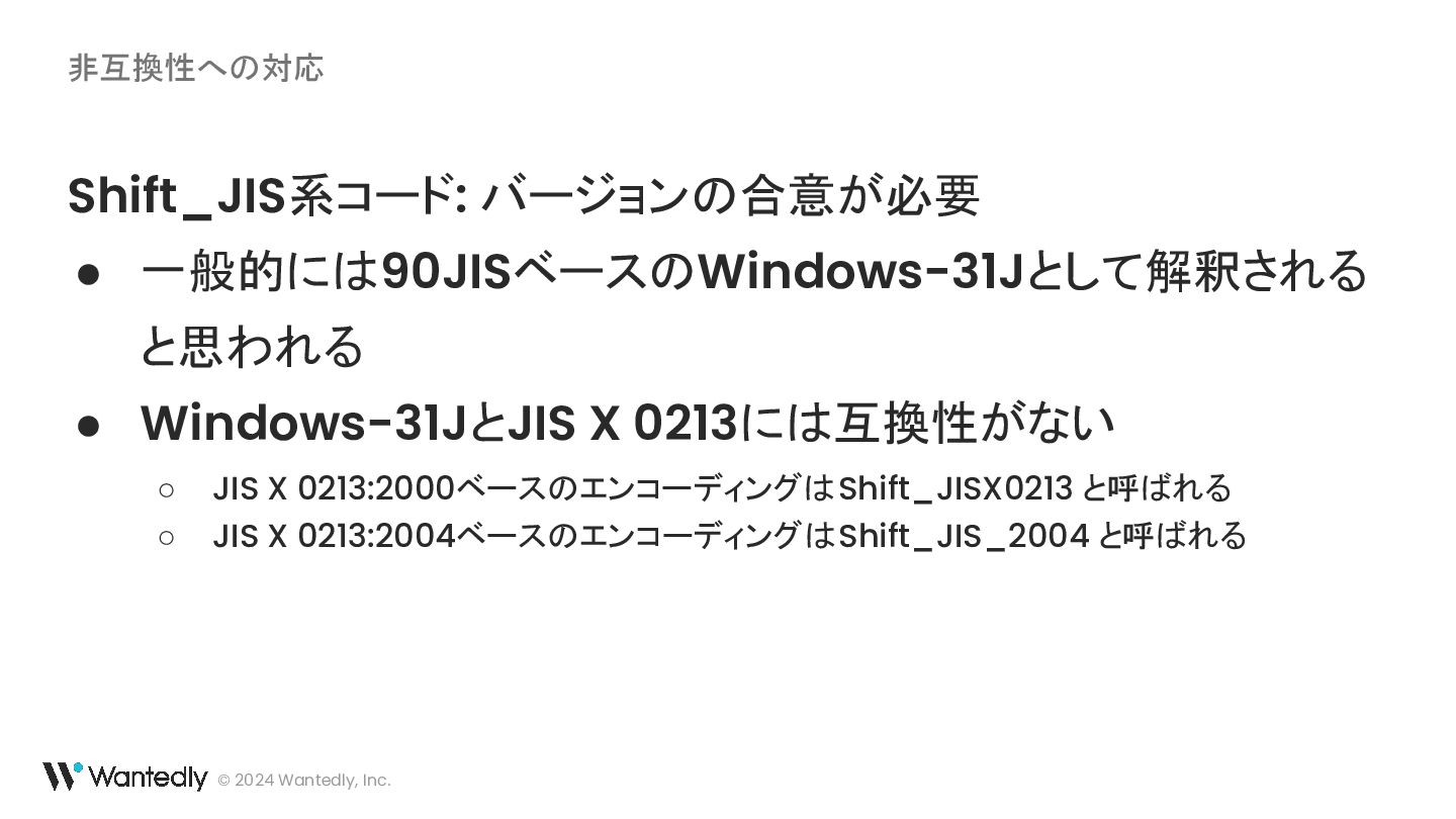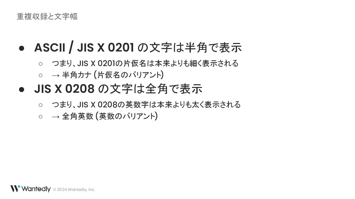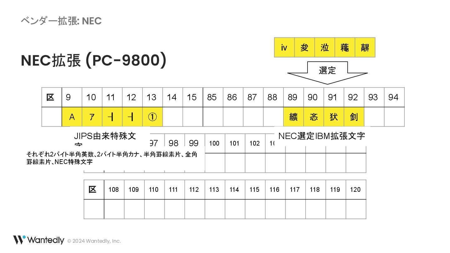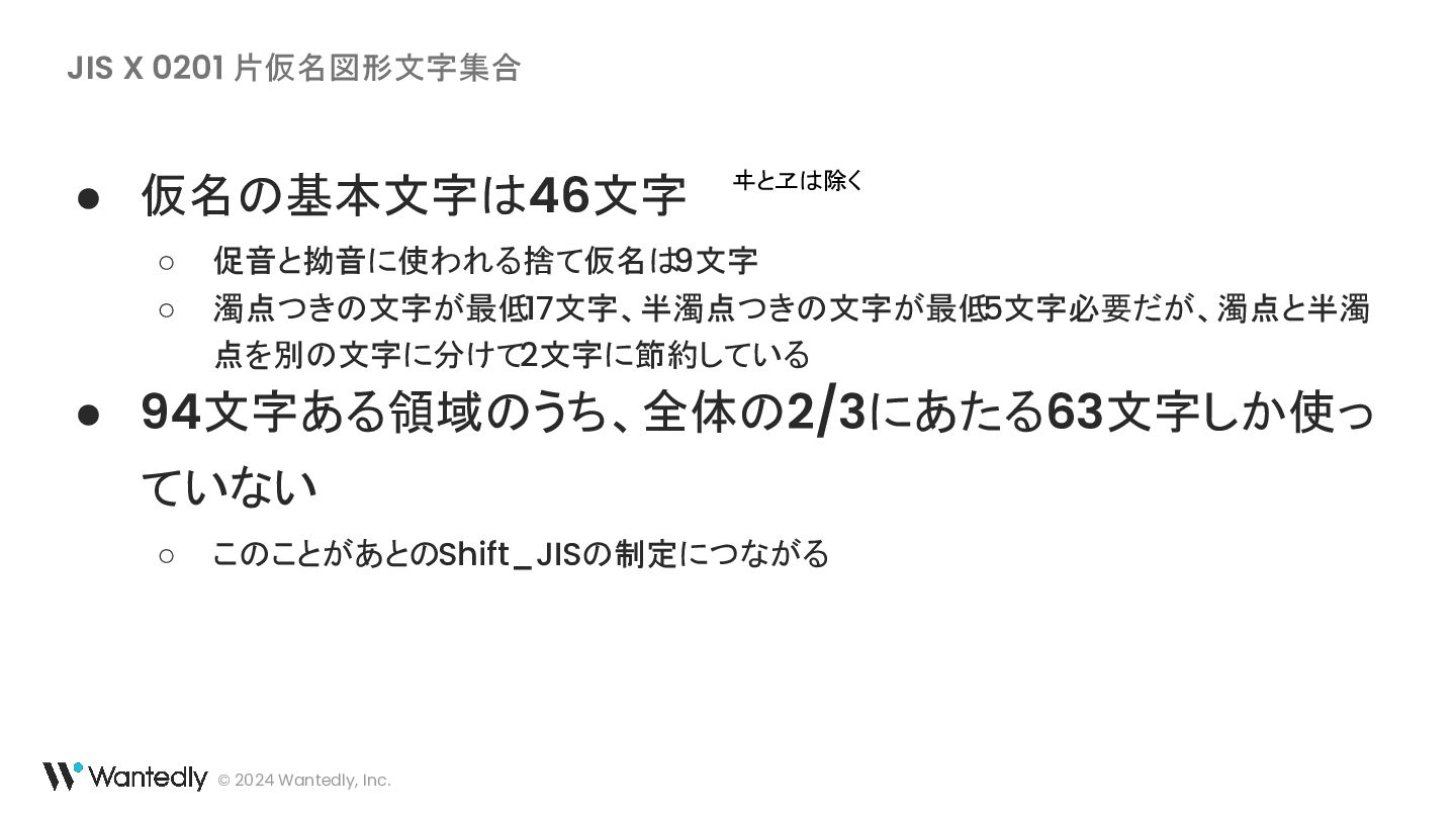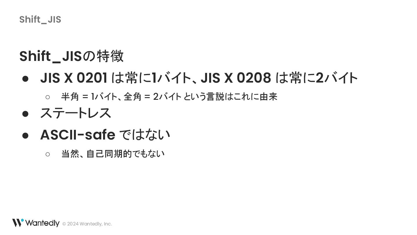 結果として、文字集合のバージョン差異に対しても厳密に動作する ◦ ASCIIと JIS X 0201 ラテン文字用文字集合も区別できる ◦ 初期版では漢字集合をJIS78とJIS83から選択可能 • JIS X 0201 仮名文字 (いわゆる半角カナ) は使わない ◦ ISO/IEC 2022上は ESC ( I で指示できるため、非公式に対応しているケースもある