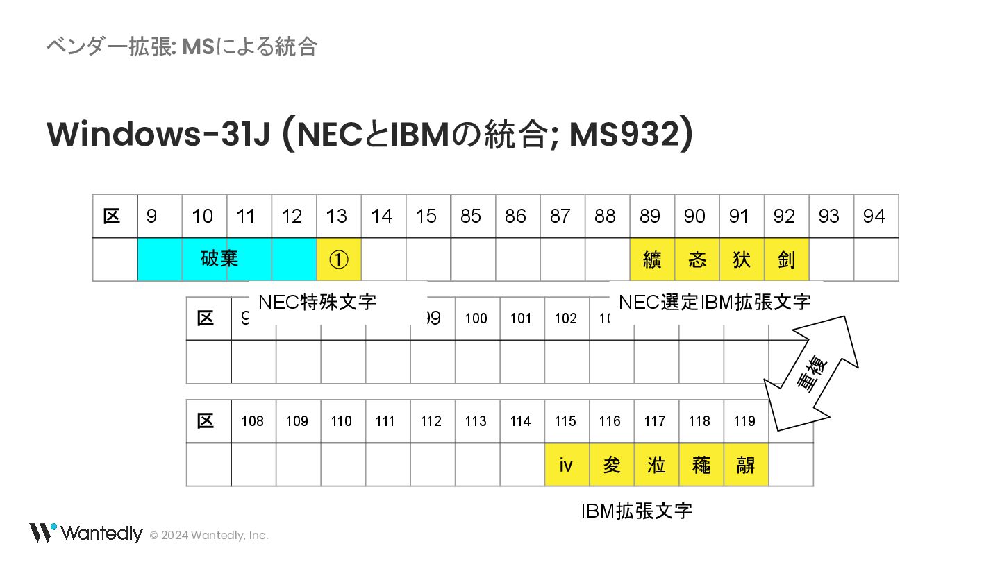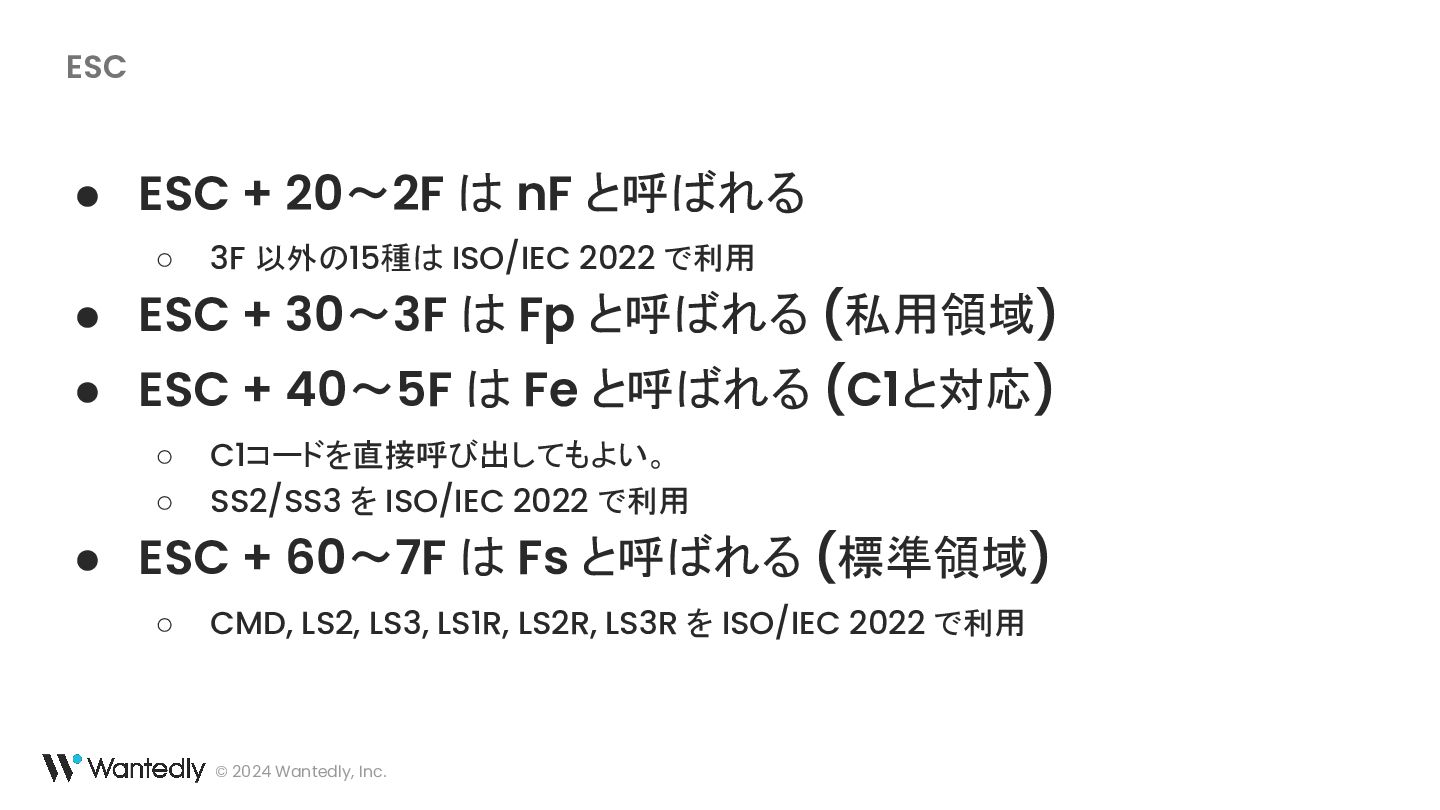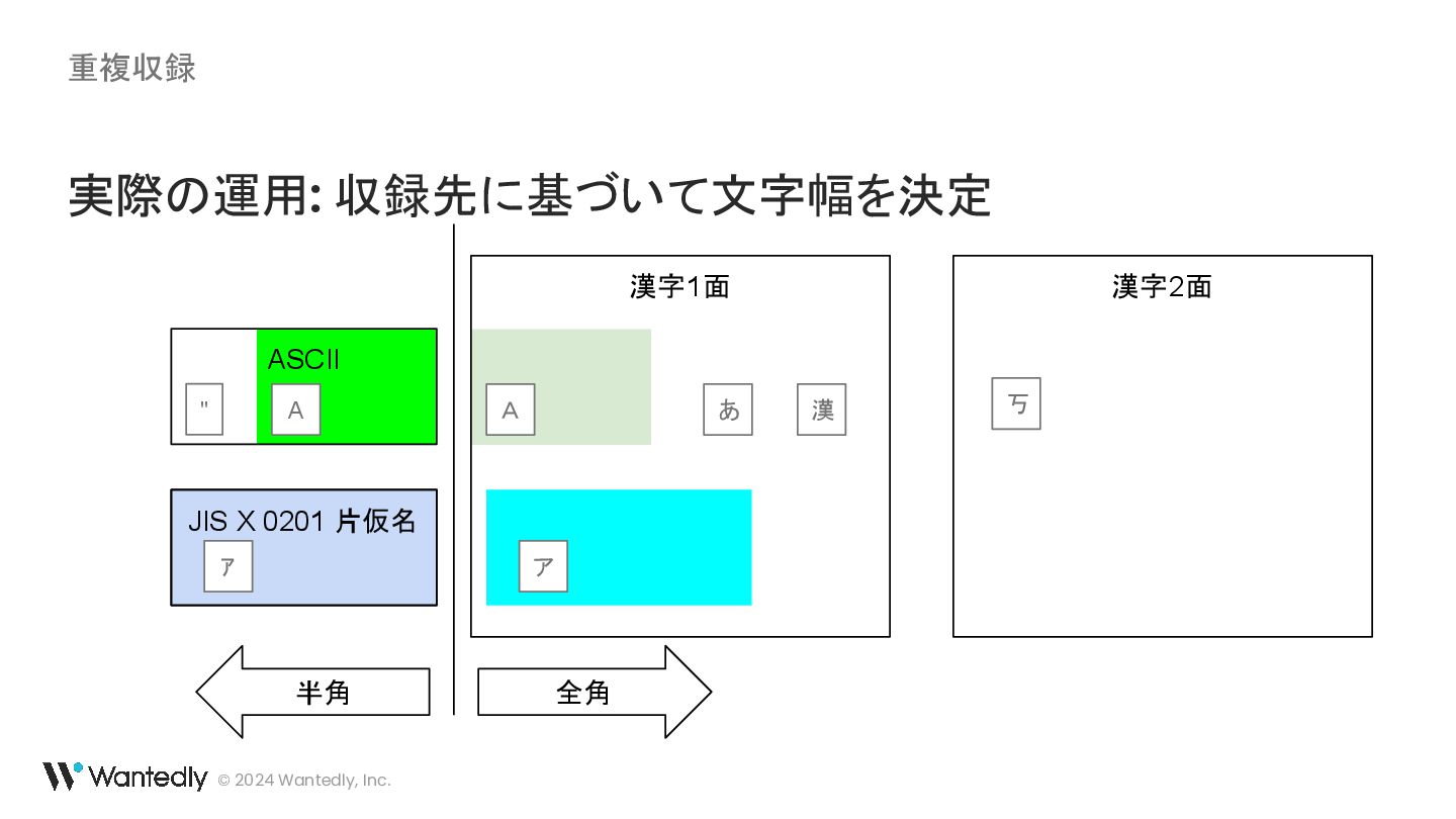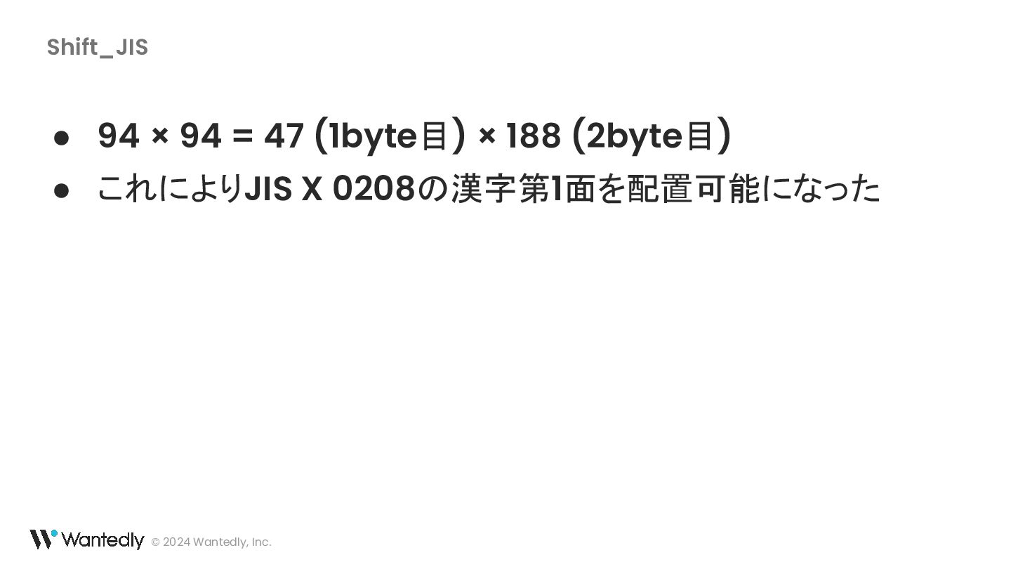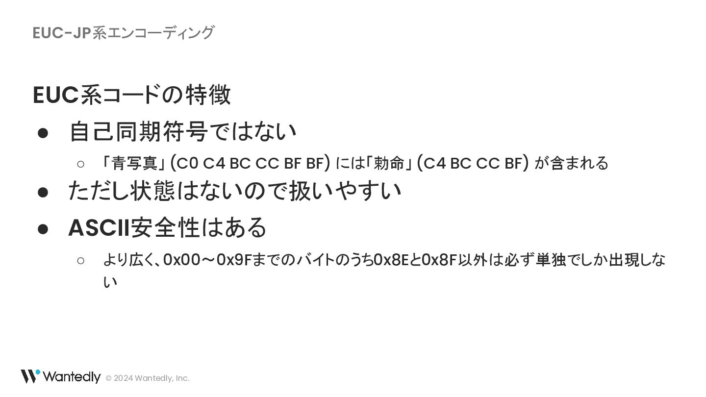 結果として、文字集合のバージョン差異に対しても厳密に動作する ◦ ASCIIと JIS X 0201 ラテン文字用文字集合も区別できる ◦ 初期版では漢字集合をJIS78とJIS83から選択可能 • JIS X 0201 仮名文字 (いわゆる半角カナ) は使わない ◦ ISO/IEC 2022上は ESC ( I で指示できるため、非公式に対応しているケースもある
