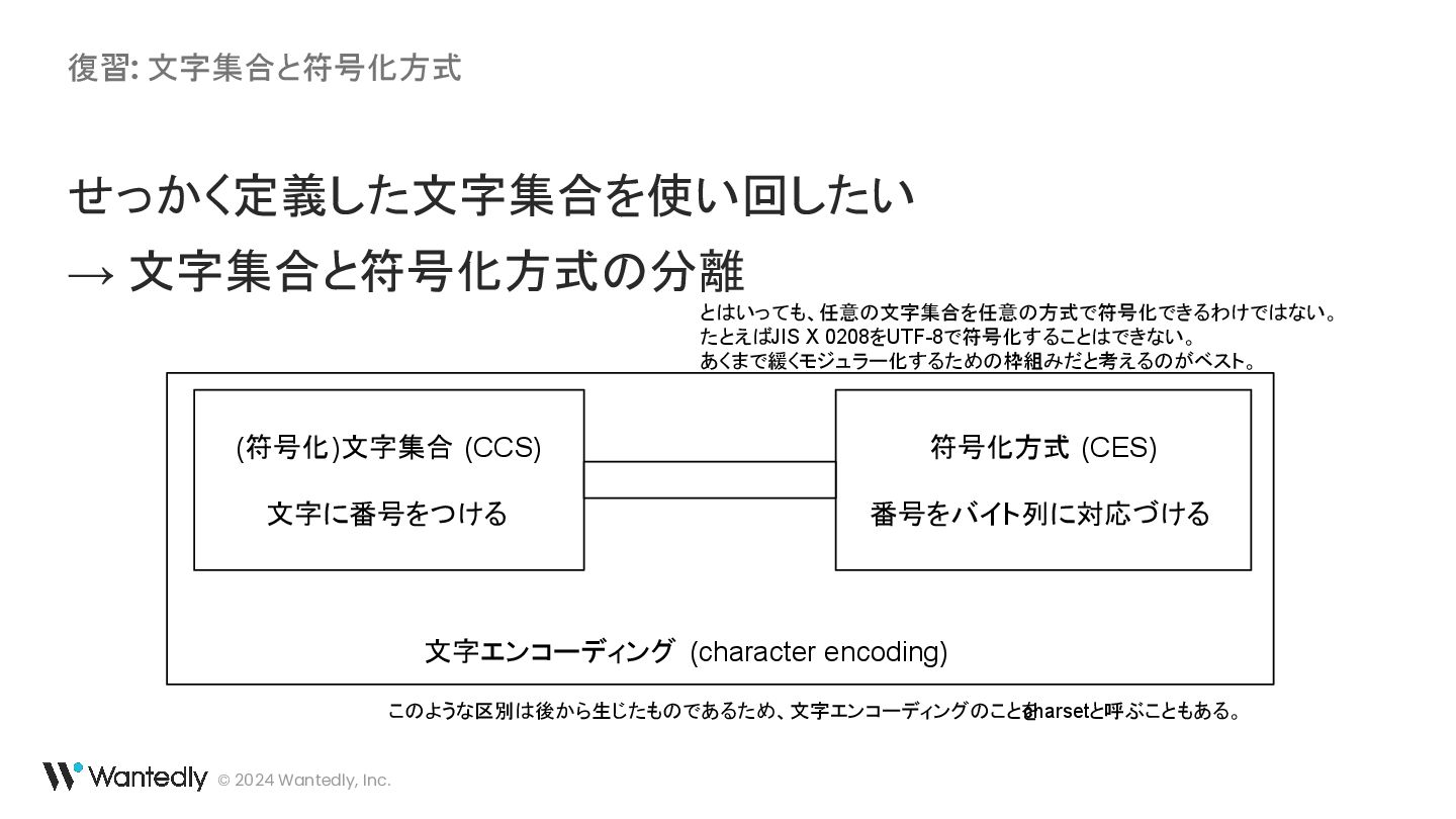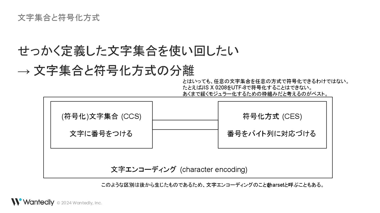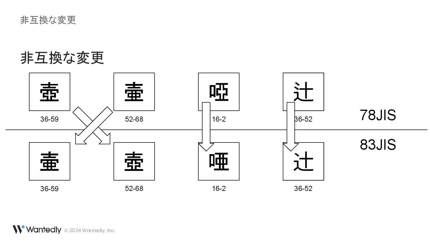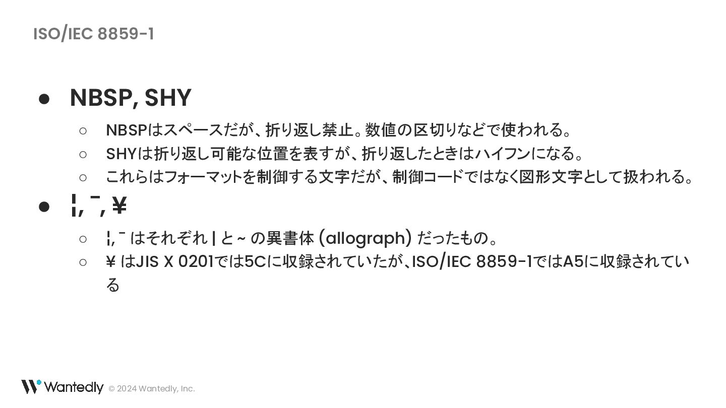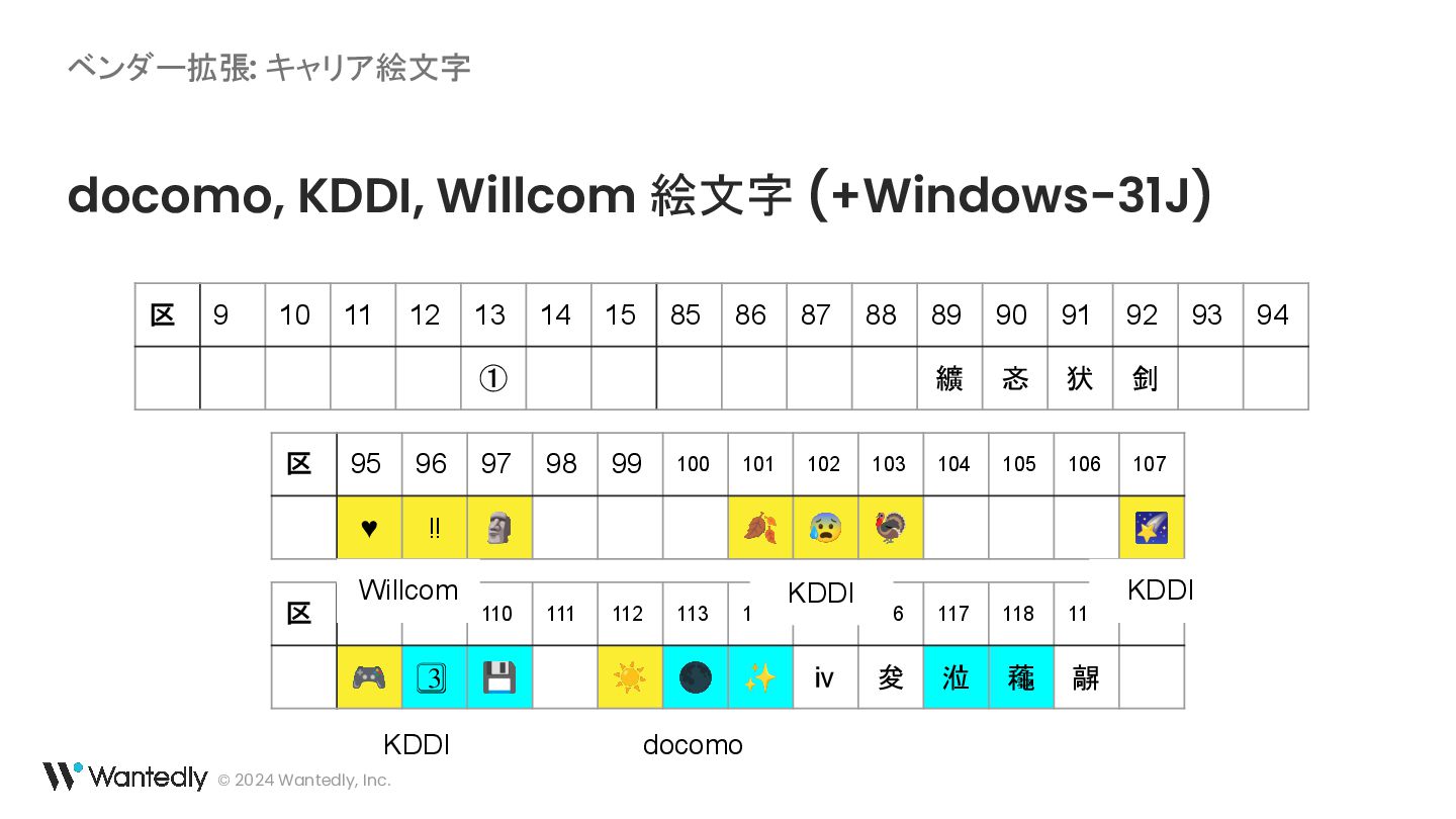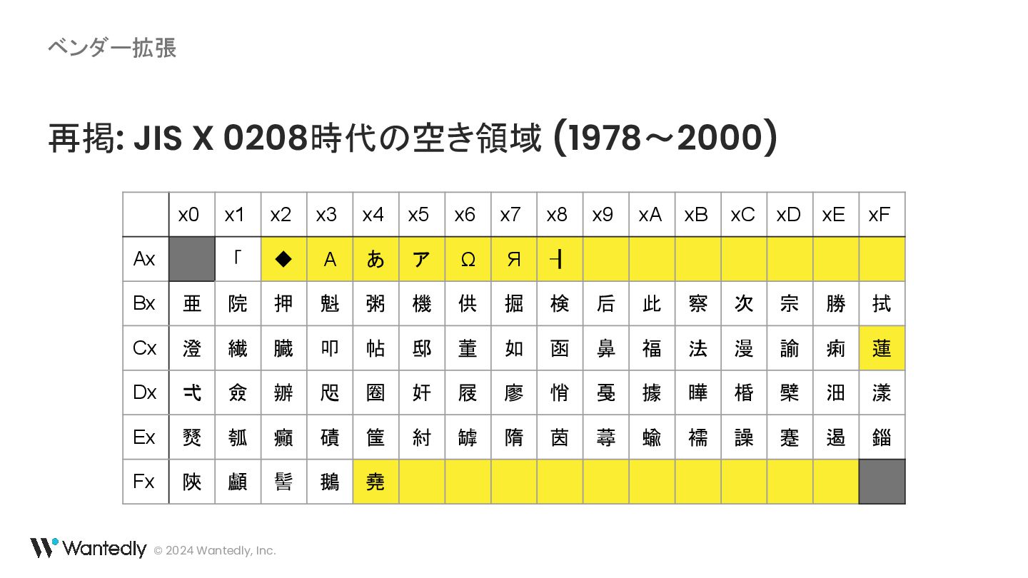 結果として、文字集合のバージョン差異に対しても厳密に動作する ◦ ASCIIと JIS X 0201 ラテン文字用文字集合も区別できる ◦ 初期版では漢字集合をJIS78とJIS83から選択可能 • JIS X 0201 仮名文字 (いわゆる半角カナ) は使わない ◦ ISO/IEC 2022上は ESC ( I で指示できるため、非公式に対応しているケースもある