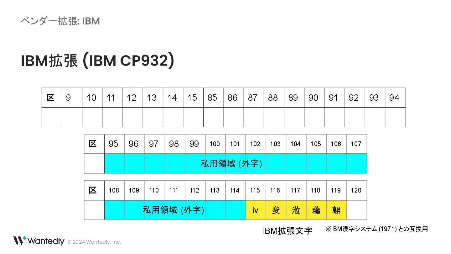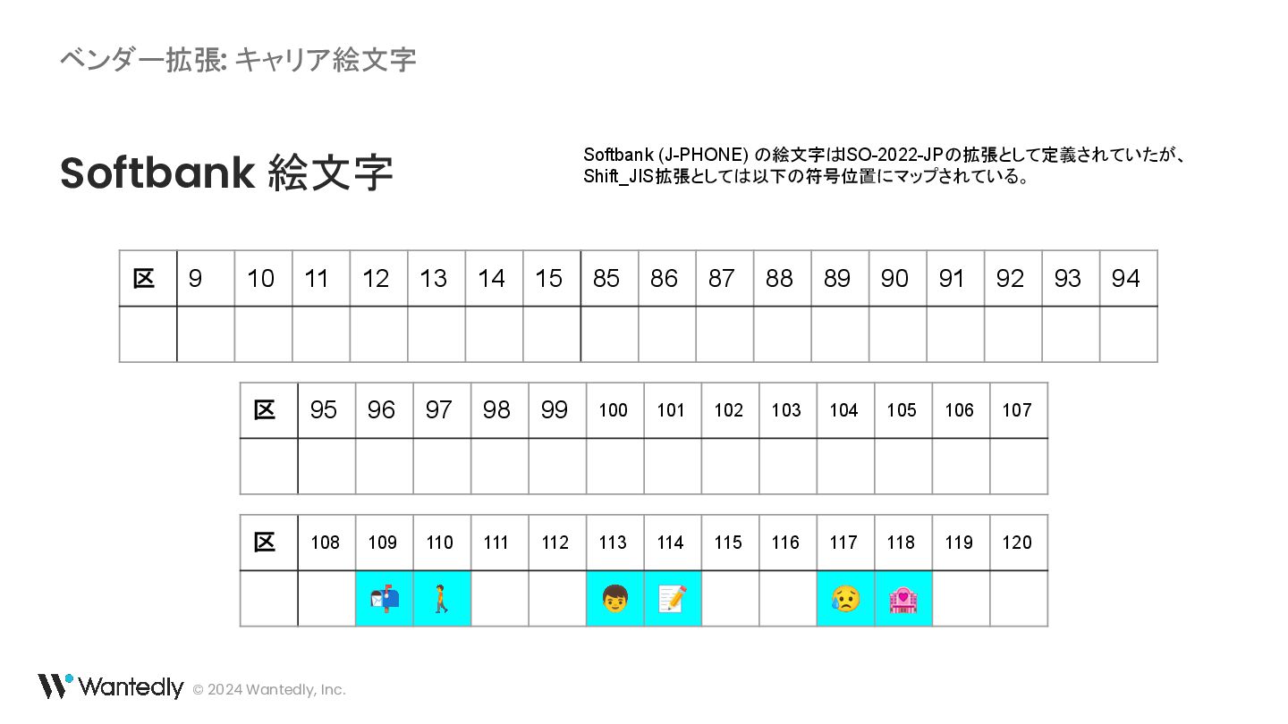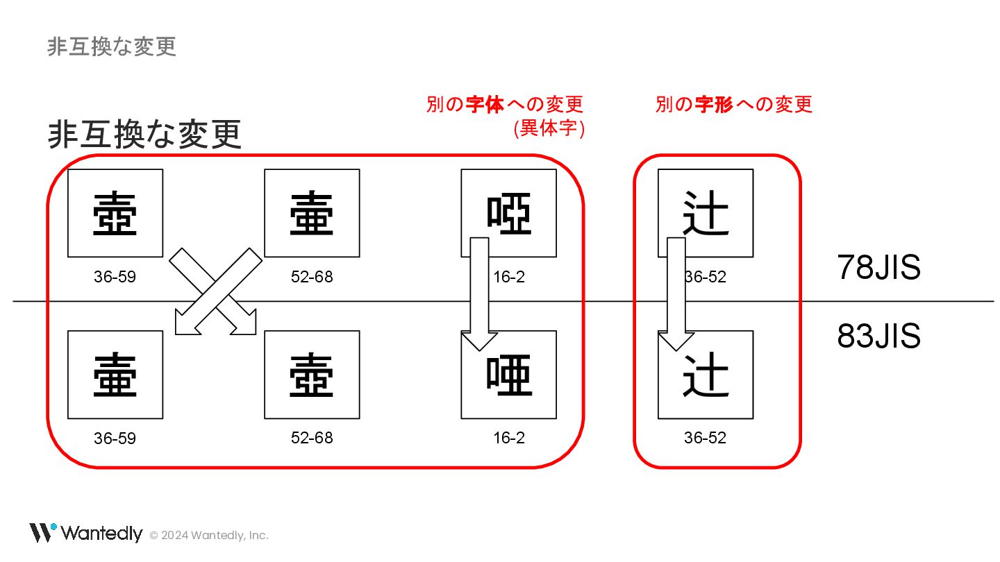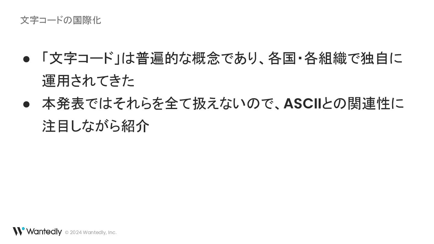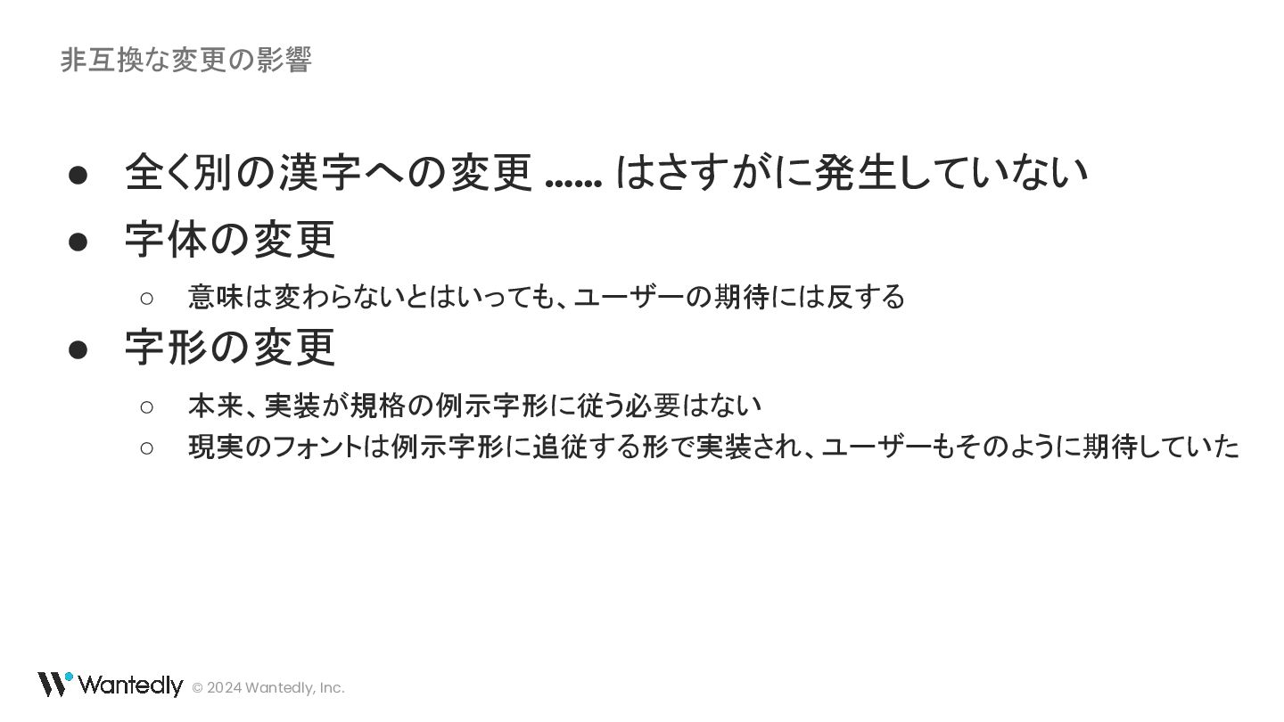 結果として、文字集合のバージョン差異に対しても厳密に動作する ◦ ASCIIと JIS X 0201 ラテン文字用文字集合も区別できる ◦ 初期版では漢字集合をJIS78とJIS83から選択可能 • JIS X 0201 仮名文字 (いわゆる半角カナ) は使わない ◦ ISO/IEC 2022上は ESC ( I で指示できるため、非公式に対応しているケースもある