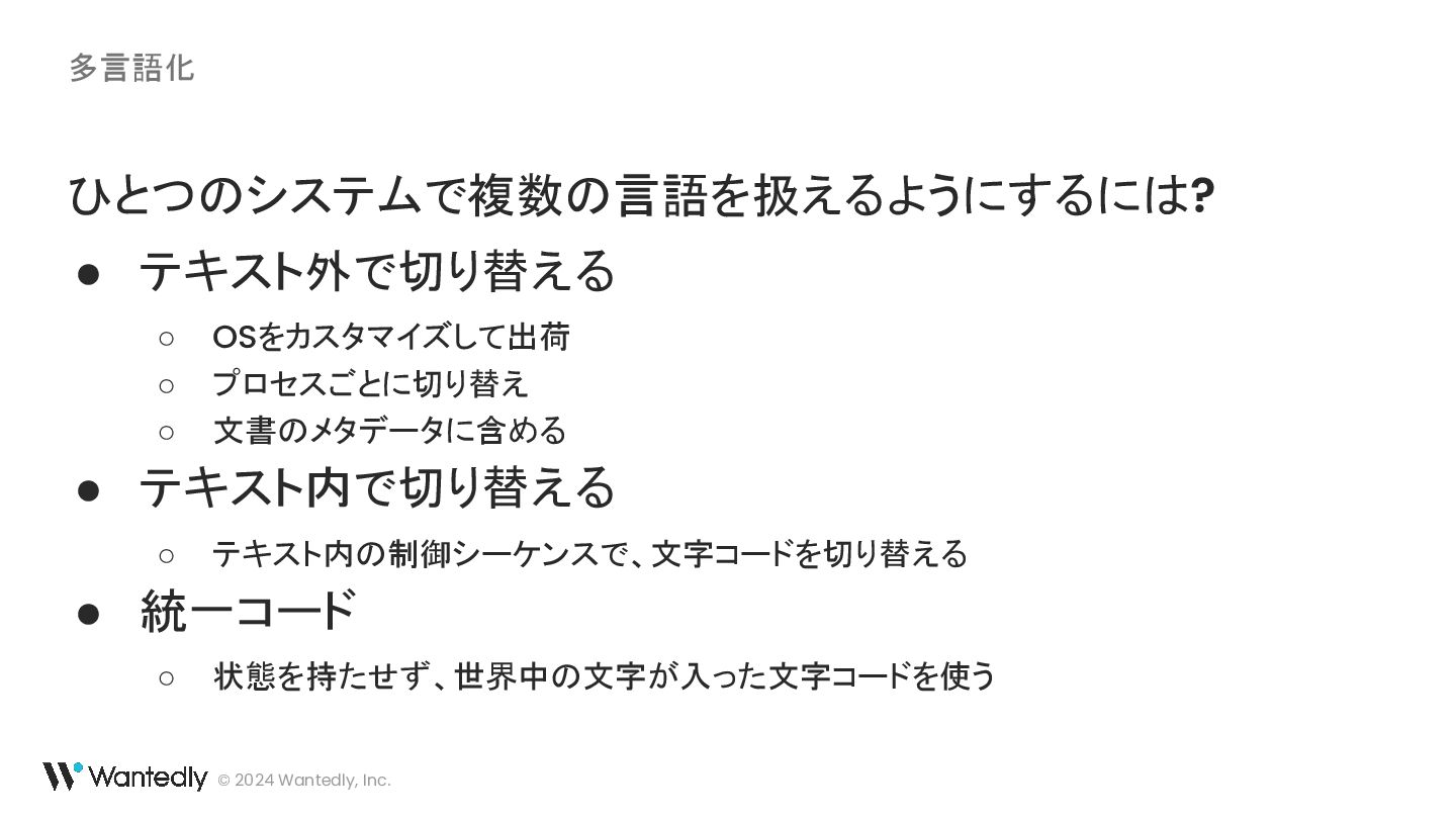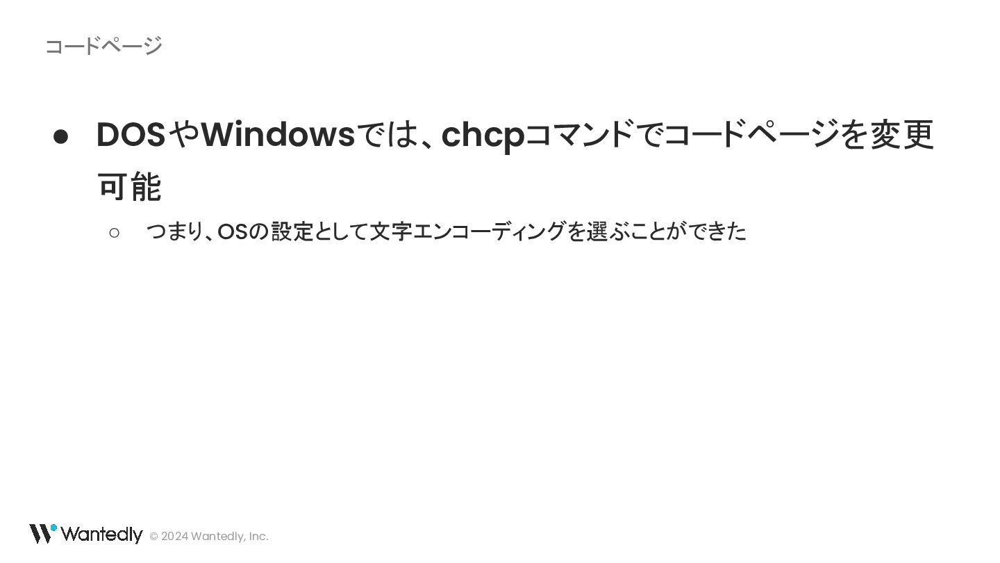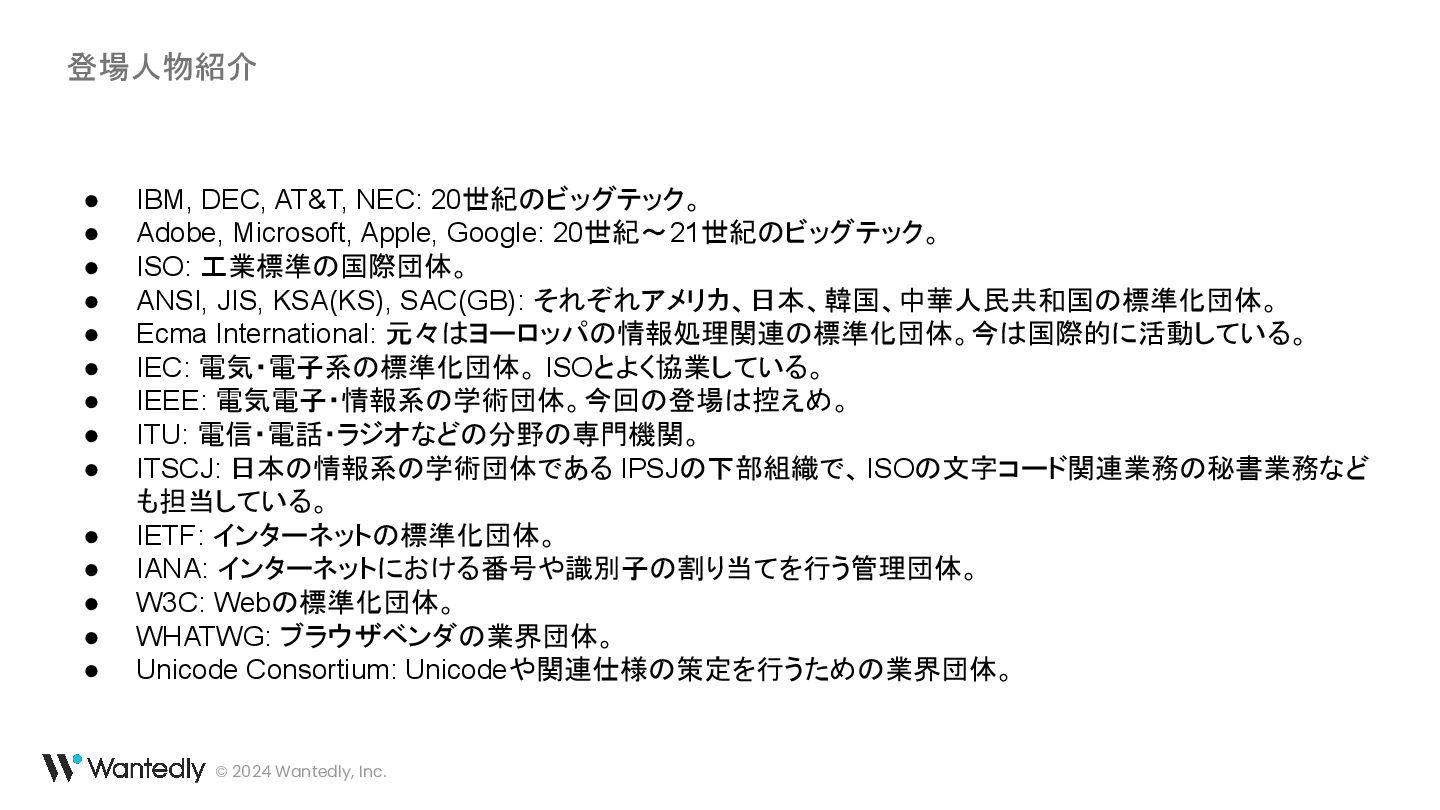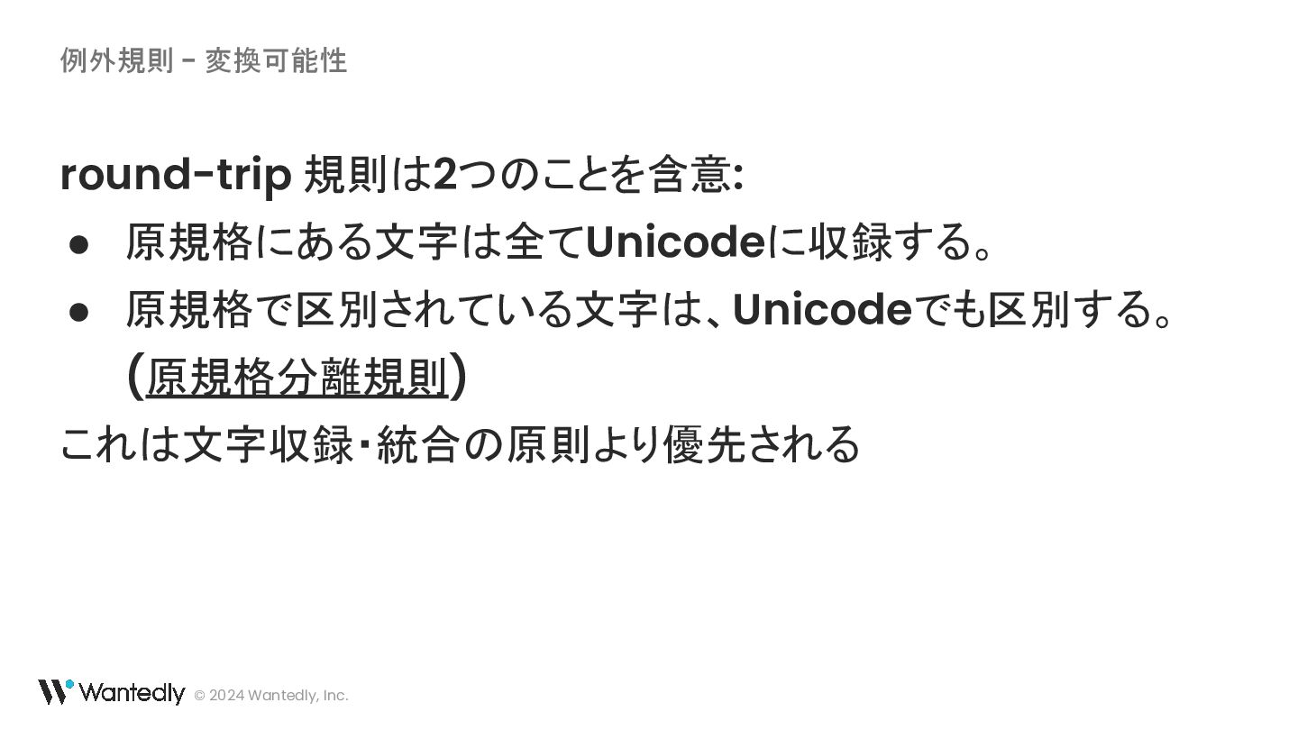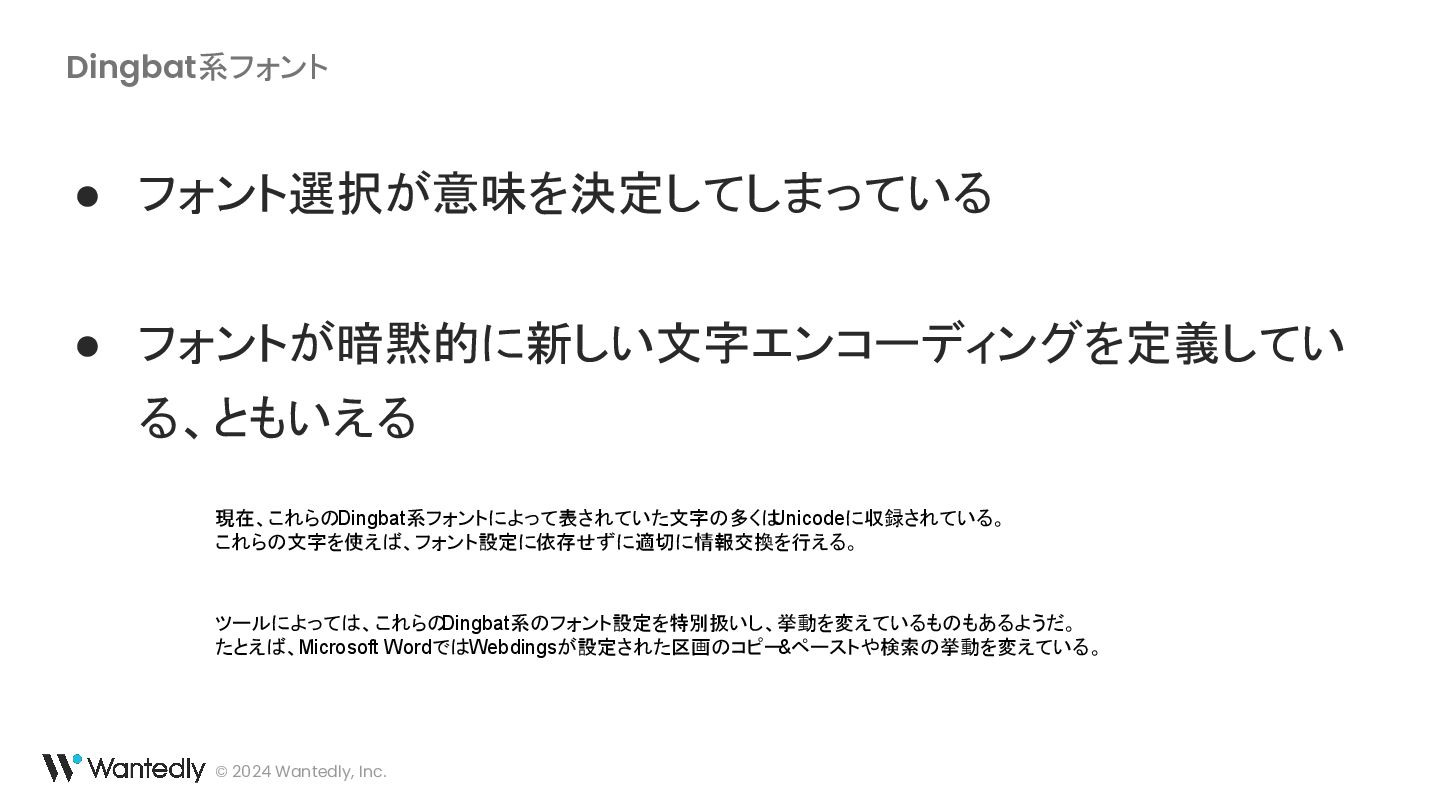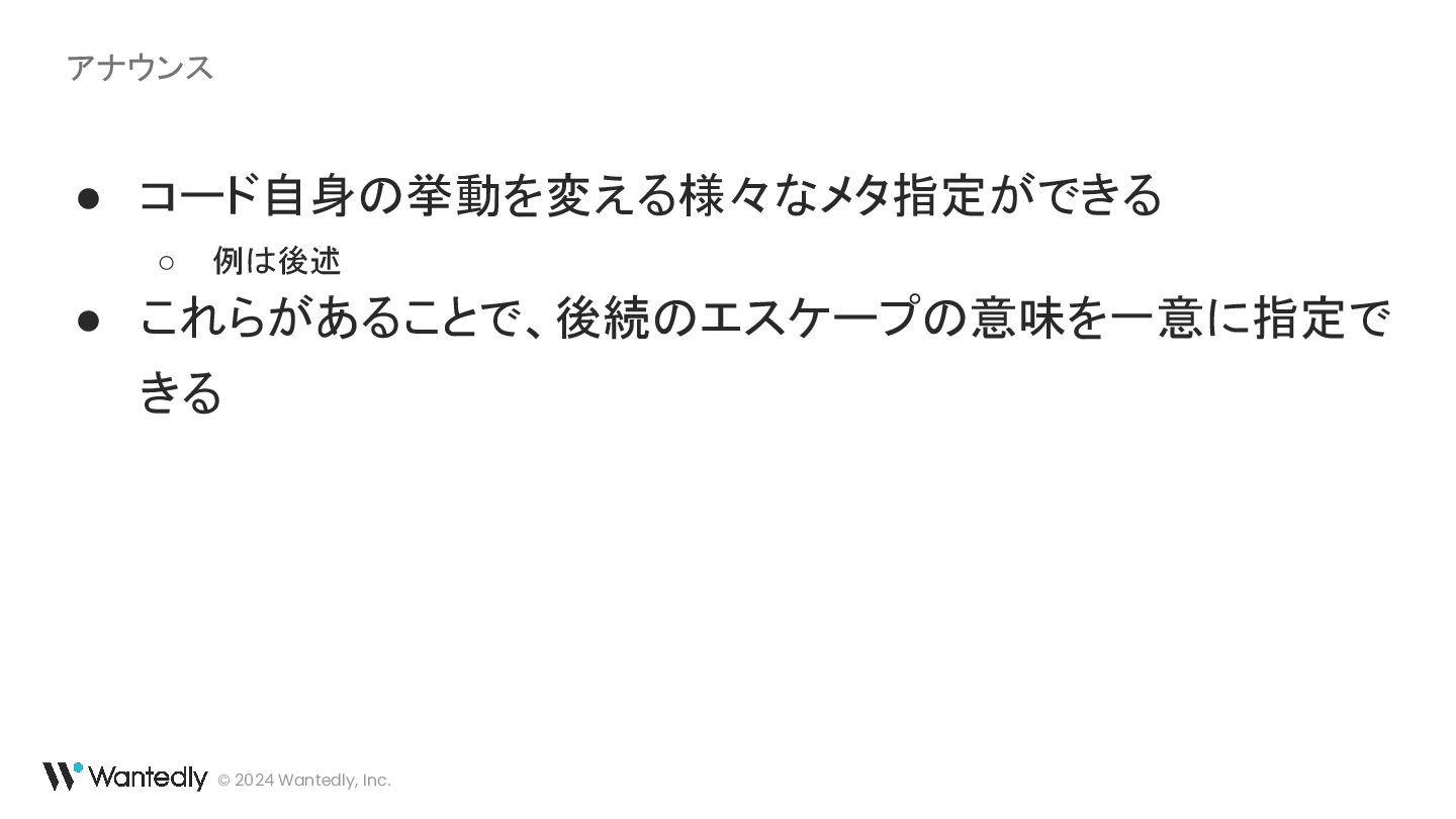 結果として、文字集合のバージョン差異に対しても厳密に動作する ◦ ASCIIと JIS X 0201 ラテン文字用文字集合も区別できる ◦ 初期版では漢字集合をJIS78とJIS83から選択可能 • JIS X 0201 仮名文字 (いわゆる半角カナ) は使わない ◦ ISO/IEC 2022上は ESC ( I で指示できるため、非公式に対応しているケースもある
