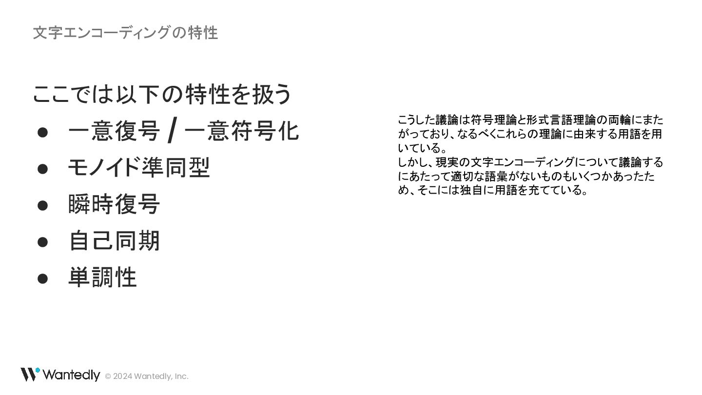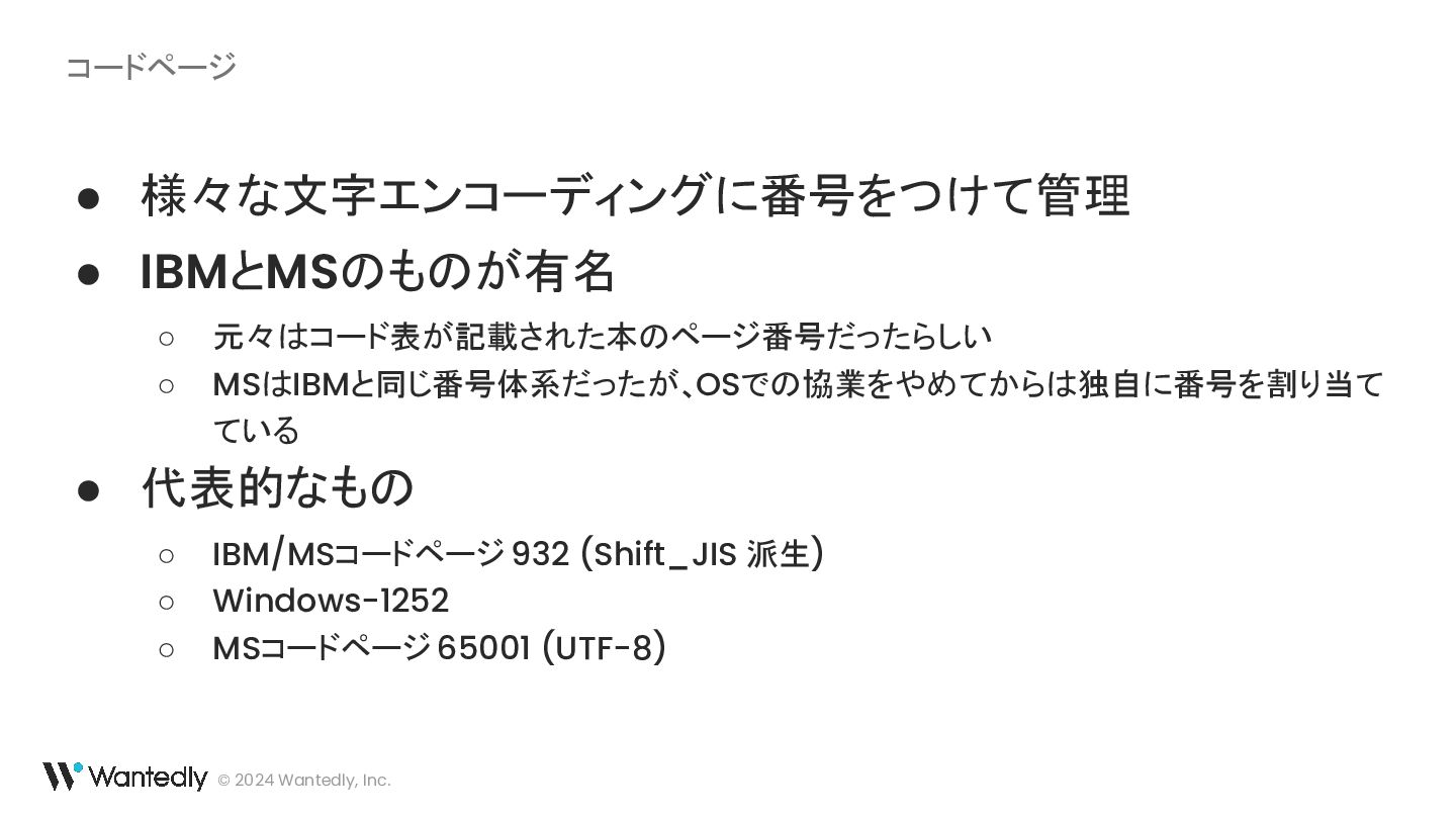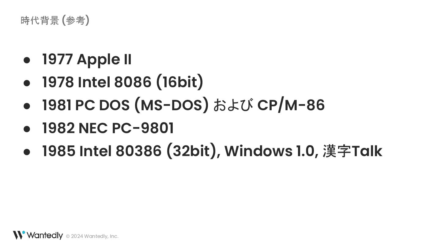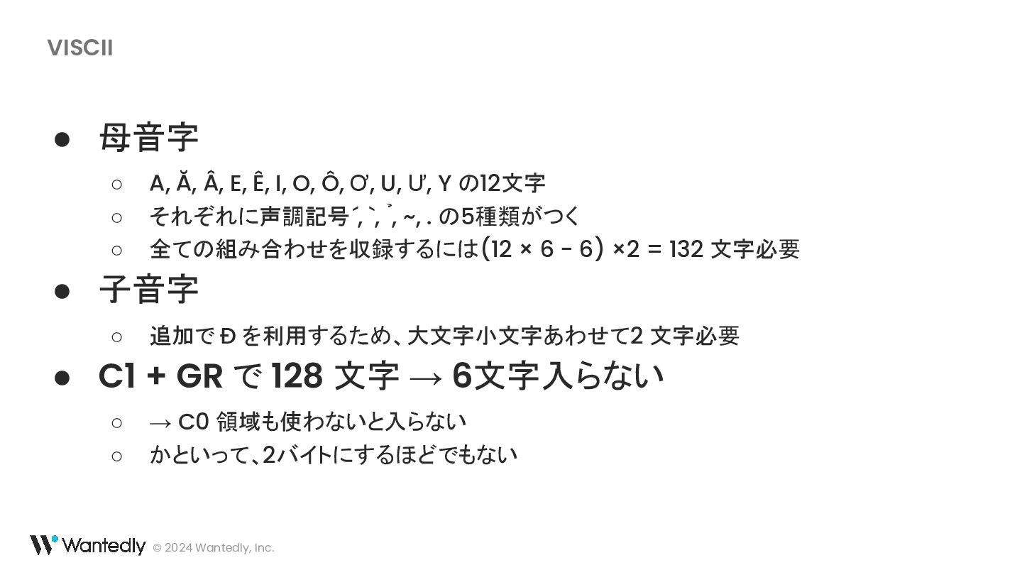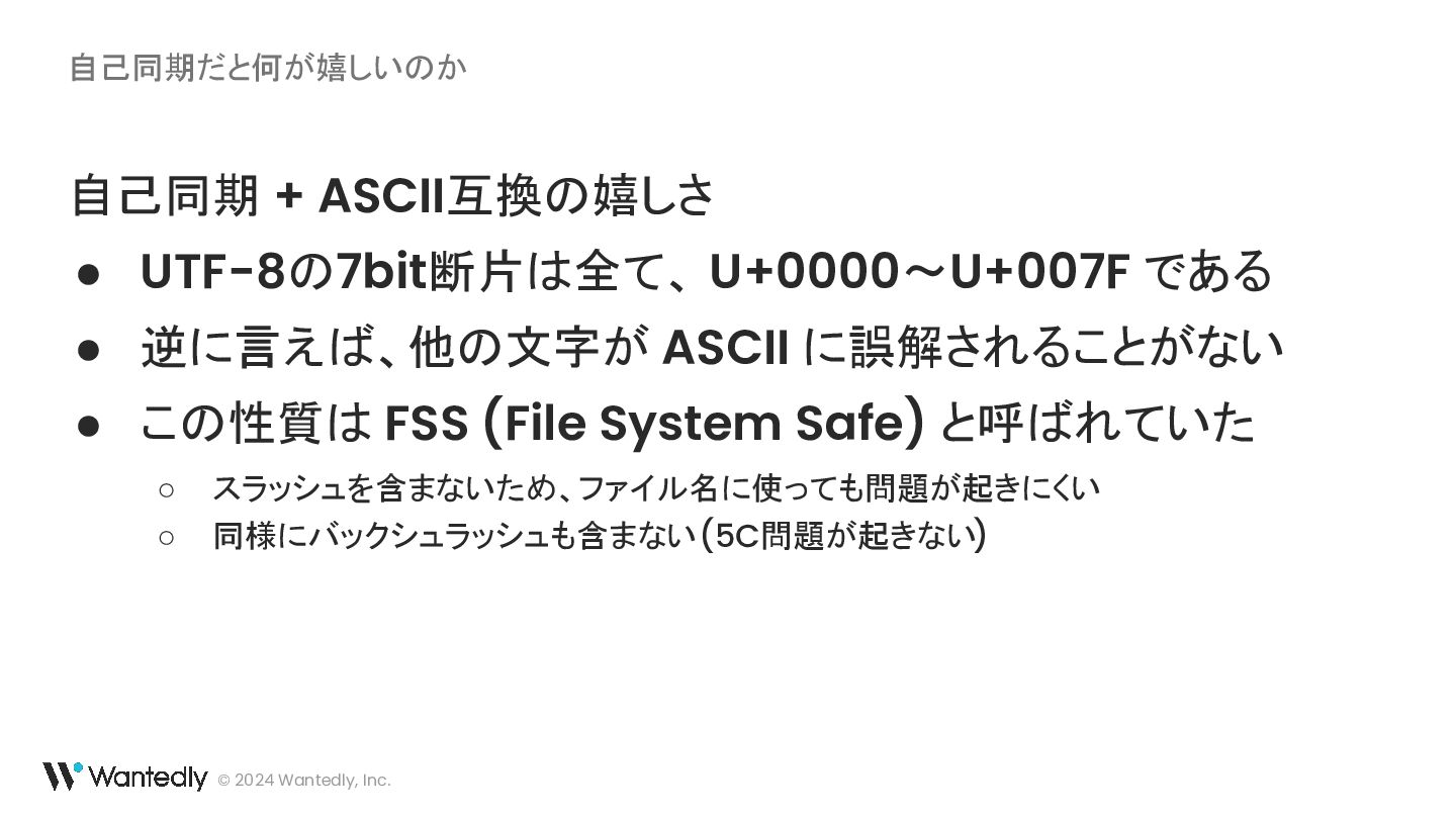 結果として、文字集合のバージョン差異に対しても厳密に動作する ◦ ASCIIと JIS X 0201 ラテン文字用文字集合も区別できる ◦ 初期版では漢字集合をJIS78とJIS83から選択可能 • JIS X 0201 仮名文字 (いわゆる半角カナ) は使わない ◦ ISO/IEC 2022上は ESC ( I で指示できるため、非公式に対応しているケースもある