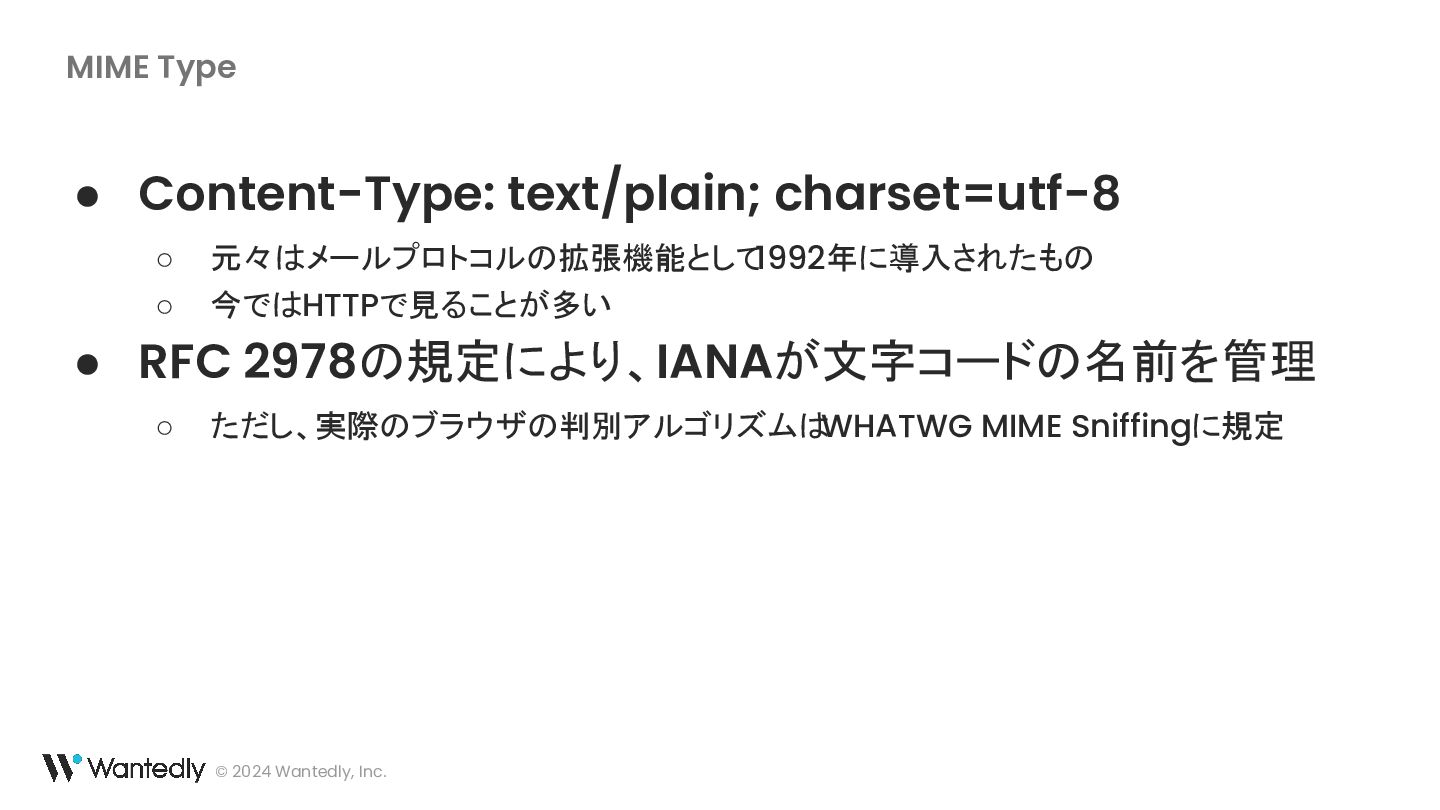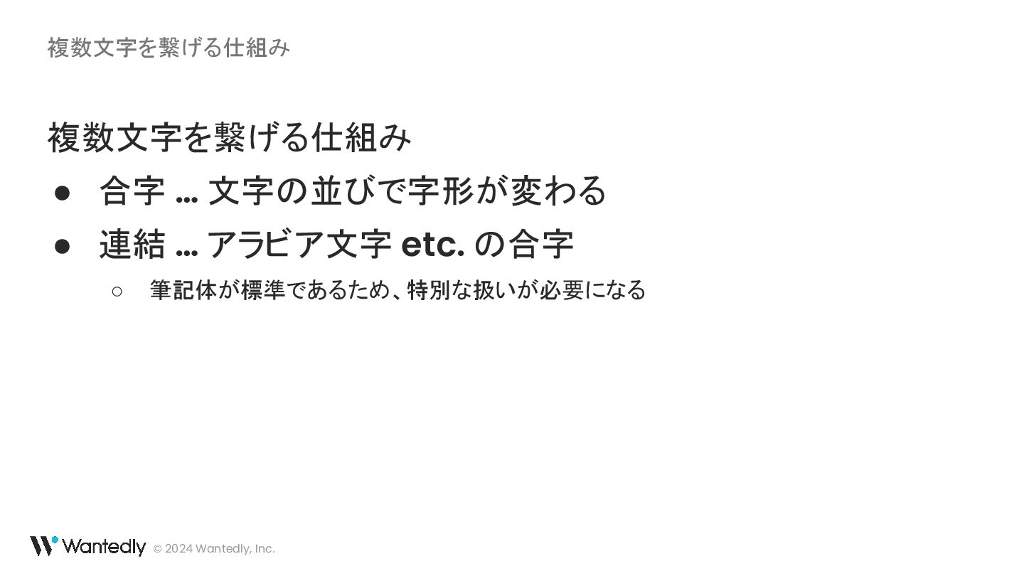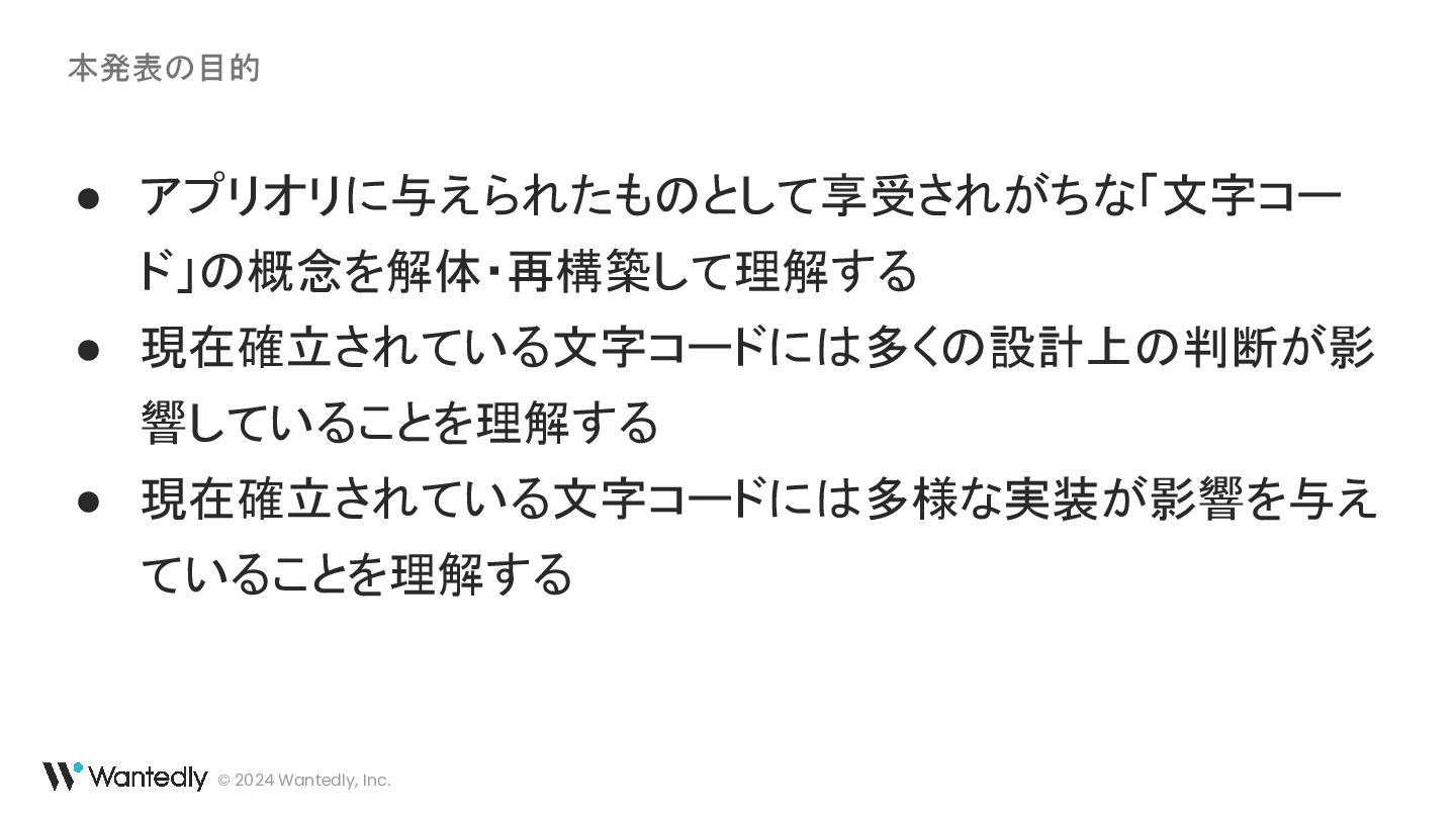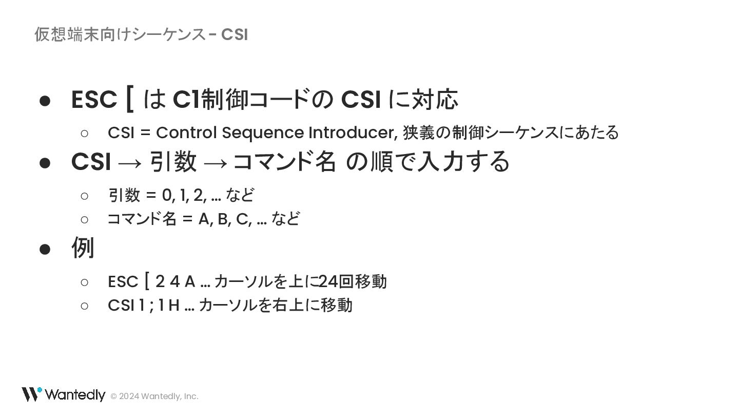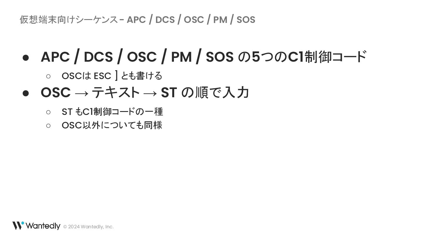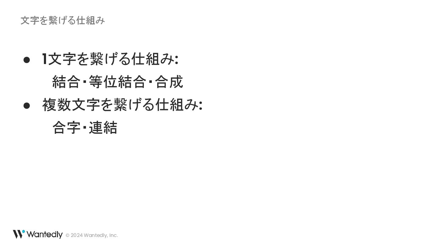 結果として、文字集合のバージョン差異に対しても厳密に動作する ◦ ASCIIと JIS X 0201 ラテン文字用文字集合も区別できる ◦ 初期版では漢字集合をJIS78とJIS83から選択可能 • JIS X 0201 仮名文字 (いわゆる半角カナ) は使わない ◦ ISO/IEC 2022上は ESC ( I で指示できるため、非公式に対応しているケースもある